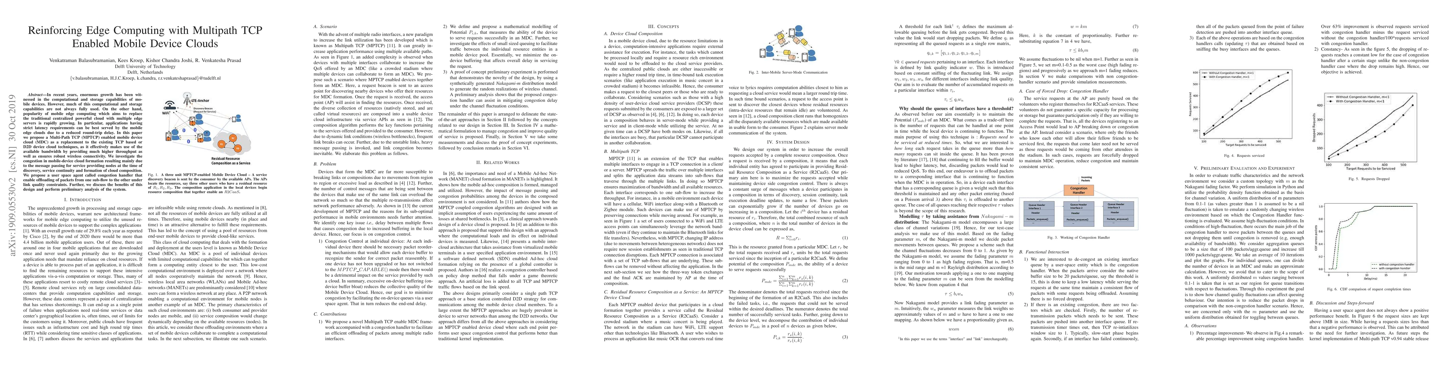 This paper proposes a Multi-Path TCP (MPTCP) enabled mobile device cloud (MDC) to enhance edge computing by utilizing underutilized mobile device capabilities and reducing latency. The study introduces a congestion handler to manage bandwidth and improve connectivity, aiming to optimize throughput and service continuity.