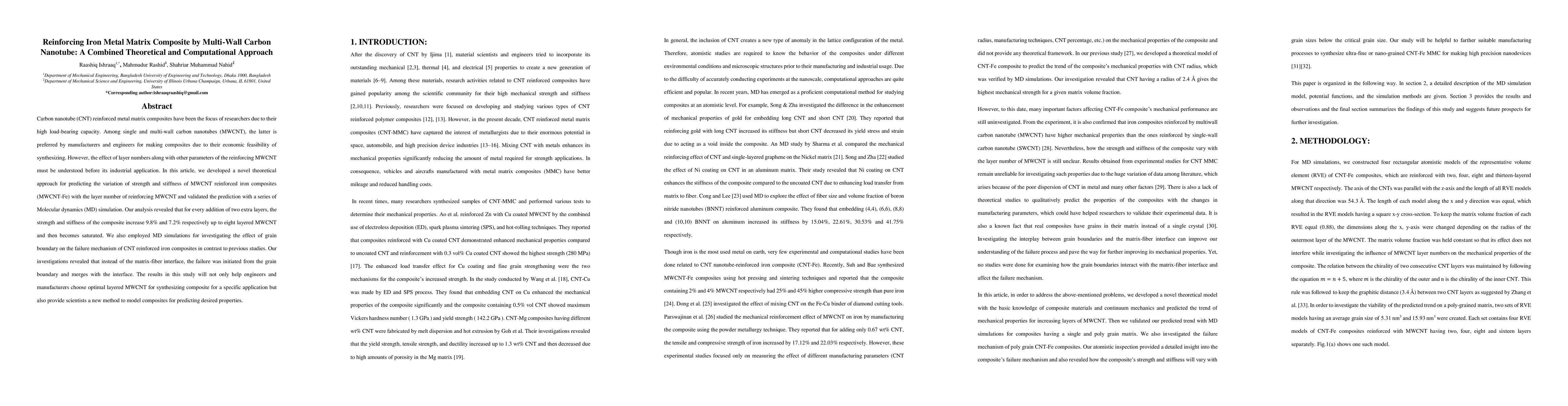 This paper presents a theoretical approach combined with molecular dynamics simulations to predict the strength and stiffness of multi-wall carbon nanotube (MWCNT) reinforced iron composites. The study finds that adding layers to MWCNT up to eight enhances composite strength and stiffness, after which the benefits plateau, and identifies grain boundary as the primary site of failure initiation.