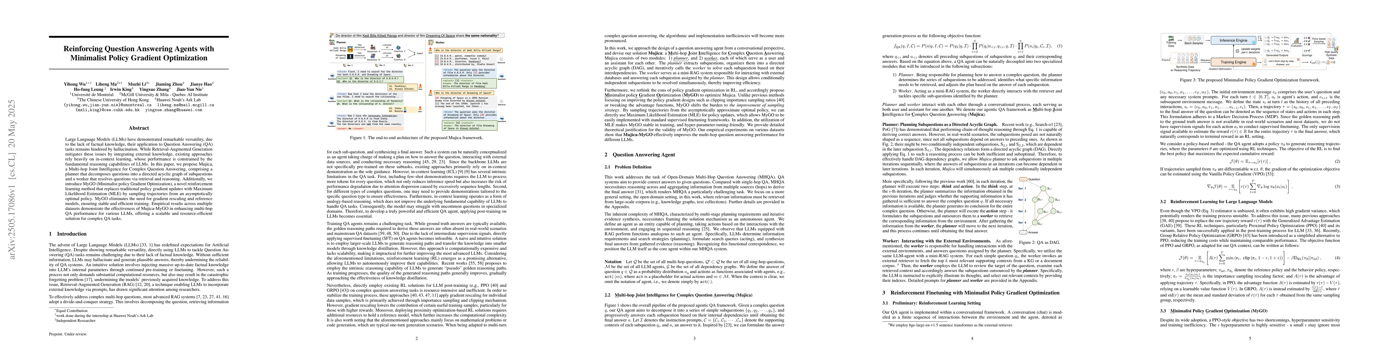 Large Language Models (LLMs) have demonstrated remarkable versatility, due to the lack of factual knowledge, their application to Question Answering (QA) tasks remains hindered by hallucination. While Retrieval-Augmented Generation mitigates these issues by integrating external knowledge, existing approaches rely heavily on in-context learning, whose performance is constrained by the fundamental reasoning capabilities of LLMs. In this paper, we propose Mujica, a Multi-hop Joint Intelligence for Complex Question Answering, comprising a planner that decomposes questions into a directed acyclic graph of subquestions and a worker that resolves questions via retrieval and reasoning. Additionally, we introduce MyGO (Minimalist policy Gradient Optimization), a novel reinforcement learning method that replaces traditional policy gradient updates with Maximum Likelihood Estimation (MLE) by sampling trajectories from an asymptotically optimal policy. MyGO eliminates the need for gradient rescaling and reference models, ensuring stable and efficient training. Empirical results across multiple datasets demonstrate the effectiveness of Mujica-MyGO in enhancing multi-hop QA performance for various LLMs, offering a scalable and resource-efficient solution for complex QA tasks.