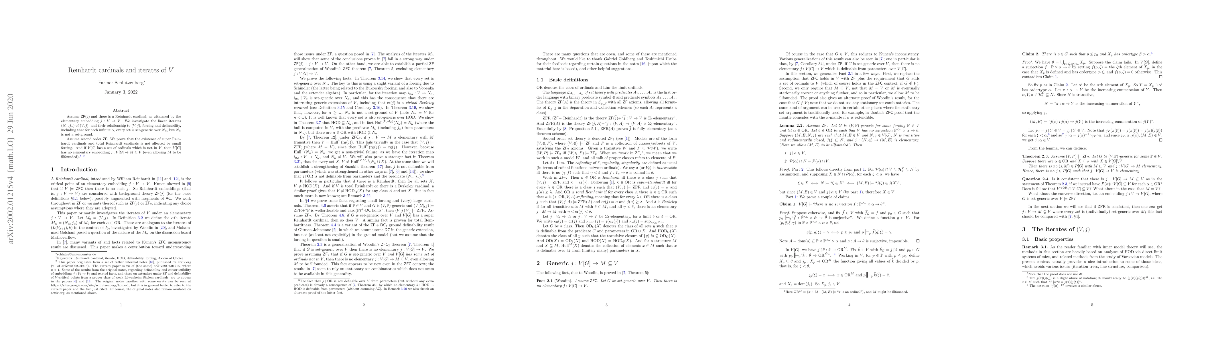 Assume ZF($j$) and there is a Reinhardt cardinal, as witnessed by the elementary embedding $j:V\to V$. We investigate the linear iterates $(N_{\alpha},j_{\alpha})$ of $(V,j)$, and their relationship to $(V,j)$, forcing and definability, including that for each infinite ordinal $\alpha$, every set is set-generic over $N_{\alpha}$, but $N_{\alpha}$ is not a set-ground. Assume second order ZF. We prove that the existence of super Reinhardt cardinals and total Reinhardt cardinals is not affected by small forcing. And if $V[G]$ has a set of ordinals which is not in $V$, then $V[G]$ has no elementary embedding $j:V[G]\to M\subseteq V$ (even allowing $M$ to be illfounded).