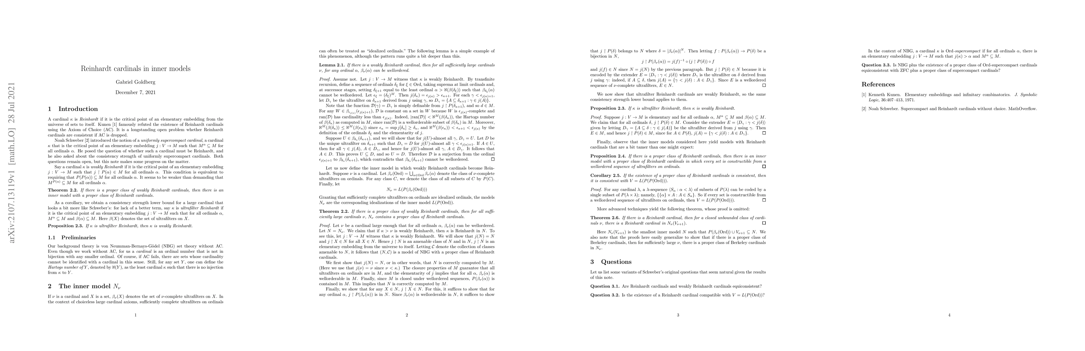A cardinal is weakly Reinhardt if it is the critical point of an elementary embedding from the universe of sets into a model that contains the double powerset of every ordinal. This note establishes the equiconsistency of a proper class of weakly Reinhardt cardinals with a proper class of Reinhardt cardinals in the context of second-order set theory without the Axiom of Choice.