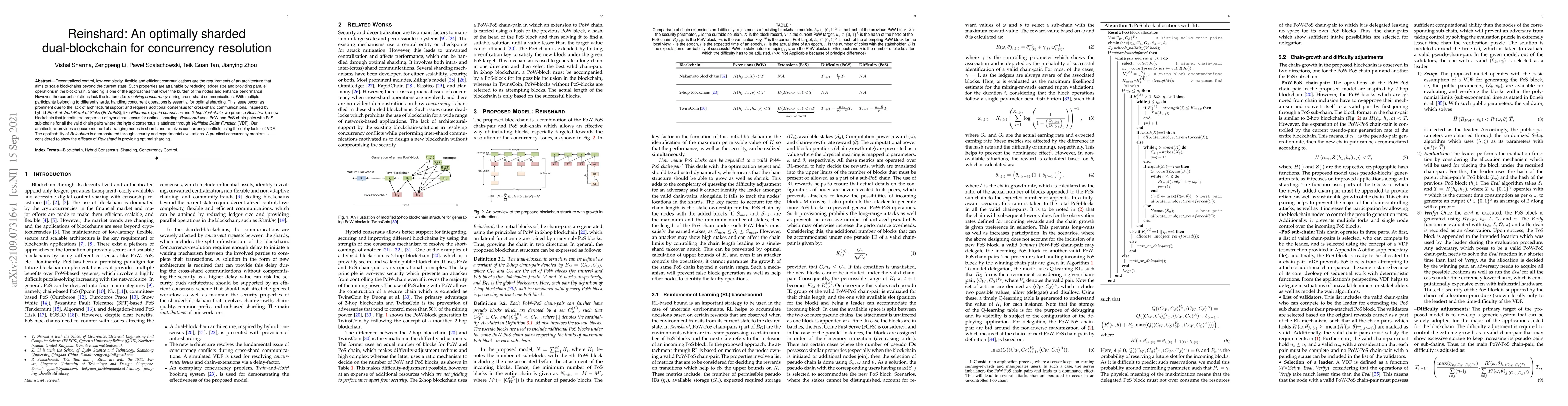 Reinshard introduces a dual-blockchain architecture with optimal sharding and hybrid consensus to enhance scalability and concurrency resolution in blockchains. It leverages Proof-of-Work/Proof-of-Stake and Verifiable Delay Function to manage cross-shard communications and resolve concurrency conflicts efficiently.