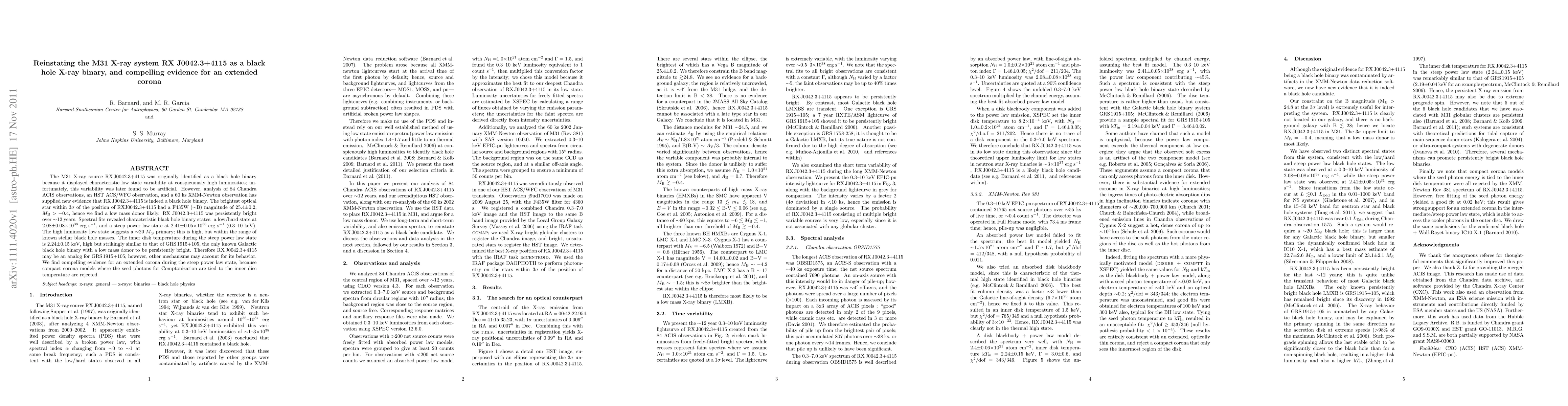 The M31 X-ray source RX J0042.3+4115 was originally identified as a black hole binary because it displayed characteristic low state variability at conspicuously high luminosities; unfortunately, this variability was later found to be artificial. However, analysis of 84 Chandra ACIS observations, an HST ACS/WFC observation, and a 60 ks XMM-Newton observation has supplied new evidence that RX J0042.3+4115 is indeed a black hole binary. The brightest optical star within 3 sigma of the position of RX J0042.3+4115 had a F435W (~B) magnitude of 25.4+/-0.2; M_B > -0.4, hence we find a low mass donor likely. RX J0042.3+4115 was persistently bright over ~12 years. Spectral fits revealed characteristic black hole binary states: a low/hard state at 2.08+/-0.08 E+38 erg/s, and a steep power law state at 2.41+/-0.05 E+38 erg/s (0.3--10 keV). The high luminosity low state suggests a ~20 M_Sun primary; this is high, but within the range of known stellar black hole masses. The inner disk temperature during the steep power law state is 2.24$\pm$0.15 keV, high but strikingly similar to that of GRS 1915+105, the only known Galactic black hole binary with a low mass donor t o be persistently bright. Therefore RX J0042.3+4115 may be an analog for GRS 1915+105; however, other mechanisms may account for its behavior. We find compelling evidence for an extended corona during the steep power law state, because compact corona models where the seed photons for Comptonization are tied to the inner disc temperature are rejected.