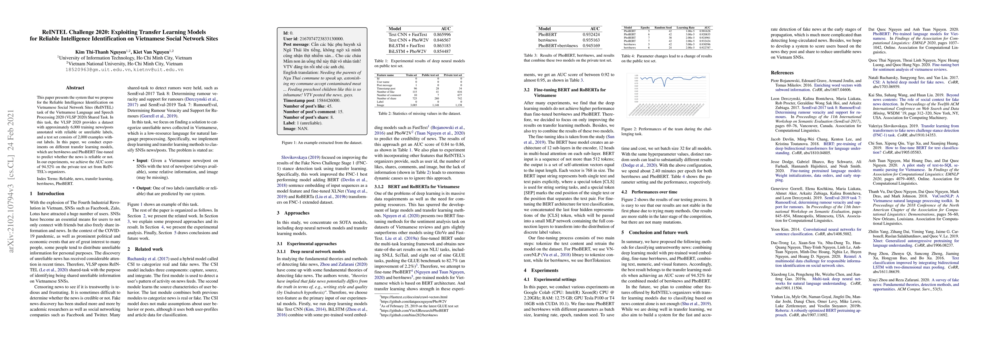 This paper presents the system that we propose for the Reliable Intelligence Indentification on Vietnamese Social Network Sites (ReINTEL) task of the Vietnamese Language and Speech Processing 2020 (VLSP 2020) Shared Task. In this task, the VLSP 2020 provides a dataset with approximately 6,000 trainning news/posts annotated with reliable or unreliable labels, and a test set consists of 2,000 examples without labels. In this paper, we conduct experiments on different transfer learning models, which are bert4news and PhoBERT fine-tuned to predict whether the news is reliable or not. In our experiments, we achieve the AUC score of 94.52% on the private test set from ReINTEL's organizers.
