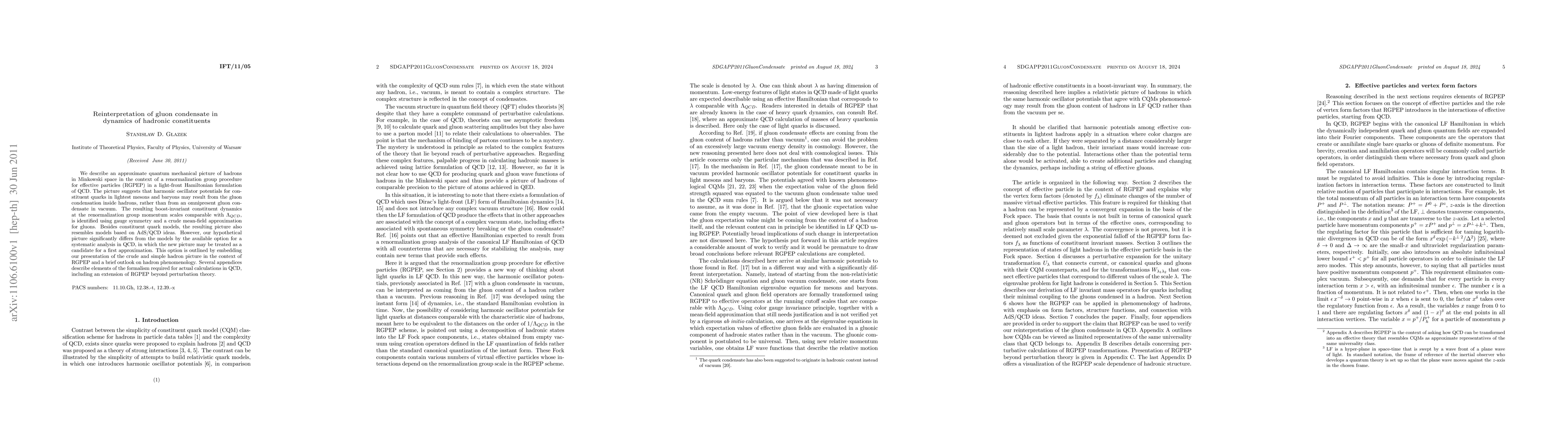 We describe an approximate quantum mechanical picture of hadrons in Minkowski space in the context of a renormalization group procedure for effective particles (RGPEP) in a light-front Hamiltonian formulation of QCD. The picture suggests that harmonic oscillator potentials for constituent quarks in lightest mesons and baryons may result from the gluon condensation inside hadrons, rather than from an omnipresent gluon condensate in vacuum. The resulting boost-invariant constituent dynamics at the renormalization group momentum scales comparable with Lambda_QCD, is identified using gauge symmetry and a crude mean-field approximation for gluons. Besides constituent quark models, the resulting picture also resembles models based on AdS/QCD ideas. However, our hypothetical picture significantly differs from the models by the available option for a systematic analysis in QCD, in which the new picture may be treated as a candidate for a first approximation. This option is outlined by embedding our presentation of the crude and simple hadron picture in the context of RGPEP and a brief outlook on hadron phenomenology. Several appendices describe elements of the formalism required for actual calculations in QCD, including an extension of RGPEP beyond perturbation theory.