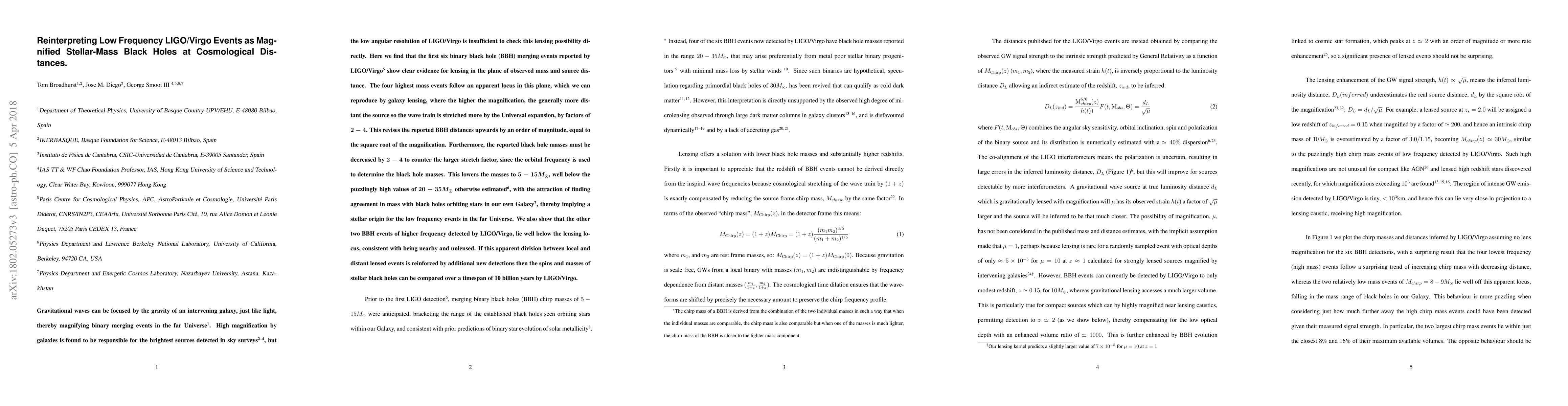 This paper reinterprets low-frequency LIGO/Virgo black hole merger events as magnified by intervening galaxies, revising the distances and masses of these events. The findings suggest that the lower frequency events are actually much farther and have lower masses than previously thought, aligning with stellar-mass black holes.