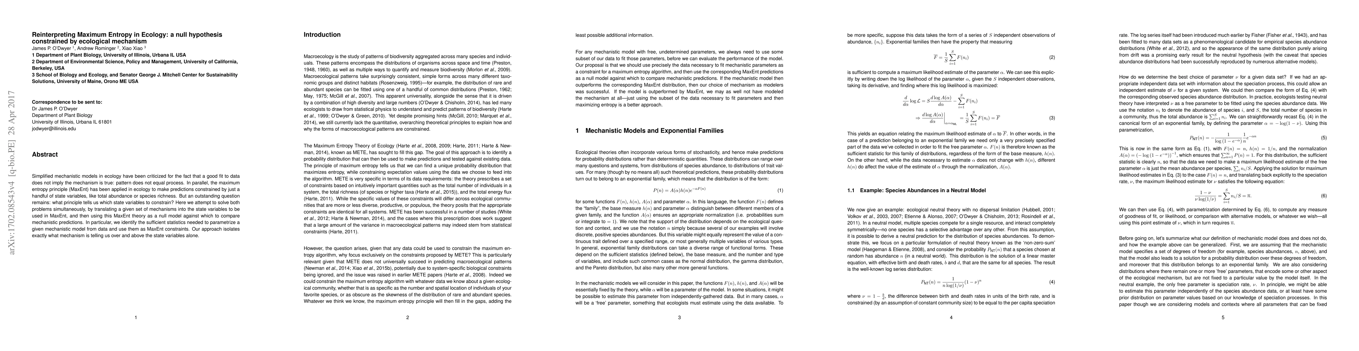 This paper proposes a method to reinterpret maximum entropy (MaxEnt) in ecology by using ecological mechanisms to determine which state variables should constrain MaxEnt models, thereby addressing the criticism that pattern does not equal process. The authors suggest using sufficient statistics from mechanistic models as constraints in MaxEnt to compare and isolate mechanistic predictions from mere state-variable fits.