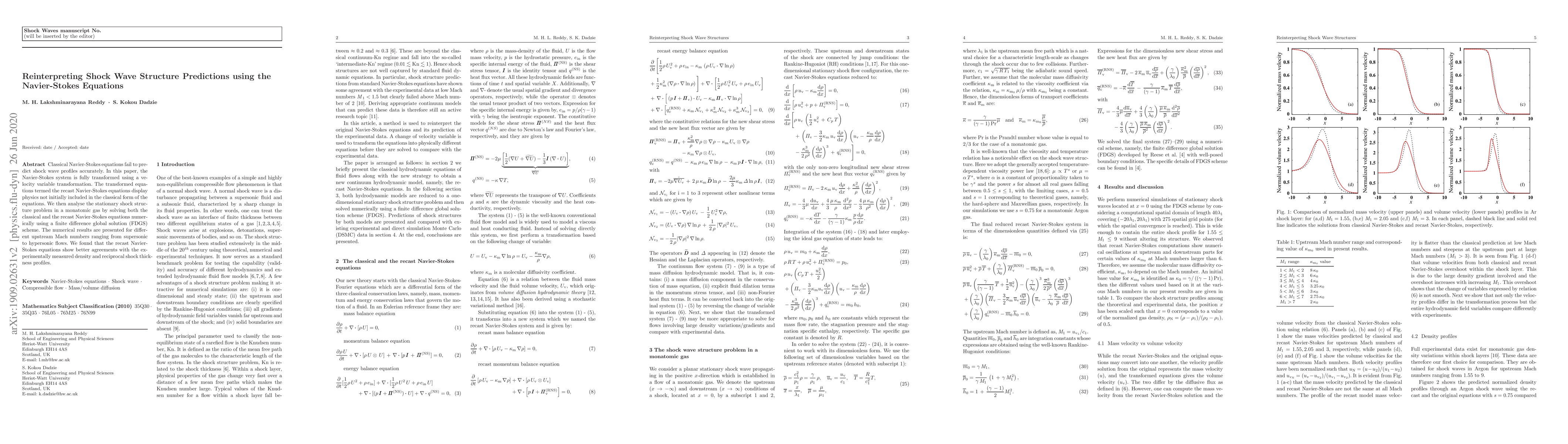 This paper reinterprets shock wave structures by transforming the Navier-Stokes equations using a velocity variable transformation, resulting in re-casted equations that better predict shock profiles. Numerical analysis using a finite difference global solution scheme shows improved agreement with experimental data compared to classical Navier-Stokes equations.