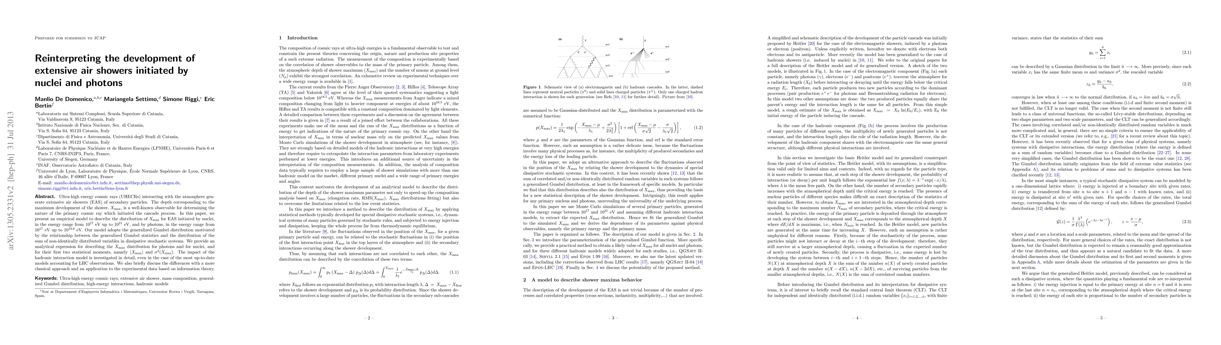 Ultra-high energy cosmic rays (UHECRs) interacting with the atmosphere generate extensive air showers (EAS) of secondary particles. The depth corresponding to the maximum development of the shower, $\Xmax$, is a well-known observable for determining the nature of the primary cosmic ray which initiated the cascade process. In this paper, we present an empirical model to describe the distribution of $\Xmax$ for EAS initiated by nuclei, in the energy range from $10^{17}$ eV up to $10^{21}$ eV, and by photons, in the energy range from $10^{17}$ eV up to $10^{19.6}$ eV. Our model adopts the generalized Gumbel distribution motivated by the relationship between the generalized Gumbel statistics and the distribution of the sum of non-identically distributed variables in dissipative stochastic systems. We provide an analytical expression for describing the $\Xmax$ distribution for photons and for nuclei, and for their first two statistical moments, namely $\langle \Xmax\rangle$ and $\sigma^{2}(\Xmax)$. The impact of the hadronic interaction model is investigated in detail, even in the case of the most up-to-date models accounting for LHC observations. We also briefly discuss the differences with a more classical approach and an application to the experimental data based on information theory.