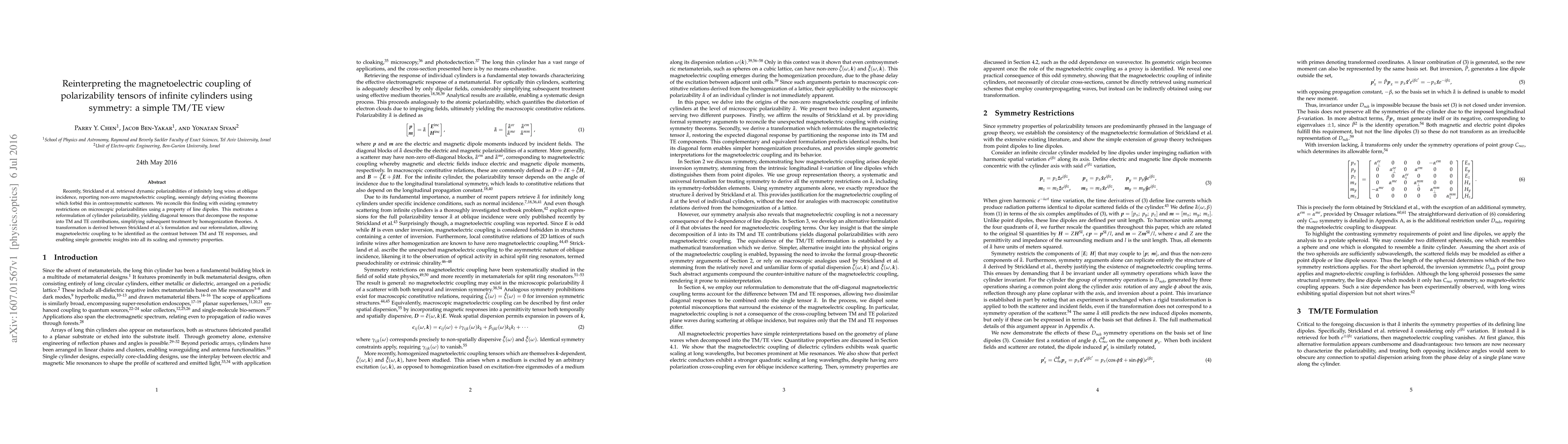 Recently, Strickland et al retrieved dynamic polarizabilities of infinitely long wires at oblique incidence, reporting non-zero magnetoelectric coupling, seemingly defying existing theorems which forbid this in centrosymmetric scatterers. We reconcile this finding with existing symmetry restrictions on microscopic polarizabilities using a property of line dipoles. This motivates a reformulation of cylinder polarizability, yielding diagonal tensors that decompose the response into TM and TE contributions, simplifying subsequent treatment by homogenization theories. A transformation is derived between Strickland et al.'s formulation and our reformulation, allowing magnetoelectric coupling to be identified as the contrast between TM and TE responses, and enabling simple geometric insights into all its scaling and symmetry properties.