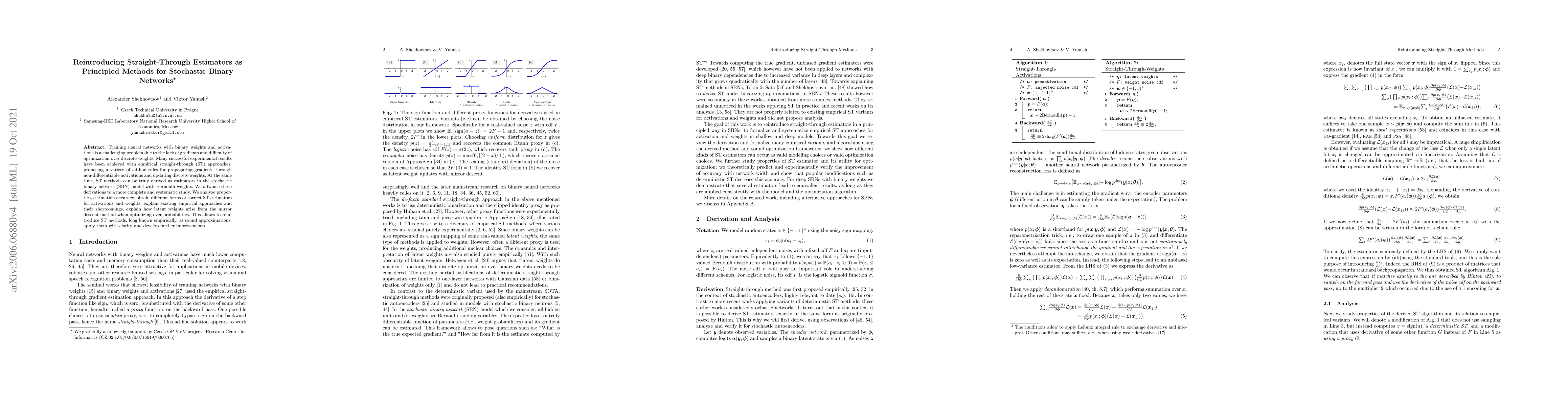 Training neural networks with binary weights and activations is a challenging problem due to the lack of gradients and difficulty of optimization over discrete weights. Many successful experimental results have been achieved with empirical straight-through (ST) approaches, proposing a variety of ad-hoc rules for propagating gradients through non-differentiable activations and updating discrete weights. At the same time, ST methods can be truly derived as estimators in the stochastic binary network (SBN) model with Bernoulli weights. We advance these derivations to a more complete and systematic study. We analyze properties, estimation accuracy, obtain different forms of correct ST estimators for activations and weights, explain existing empirical approaches and their shortcomings, explain how latent weights arise from the mirror descent method when optimizing over probabilities. This allows to reintroduce ST methods, long known empirically, as sound approximations, apply them with clarity and develop further improvements.