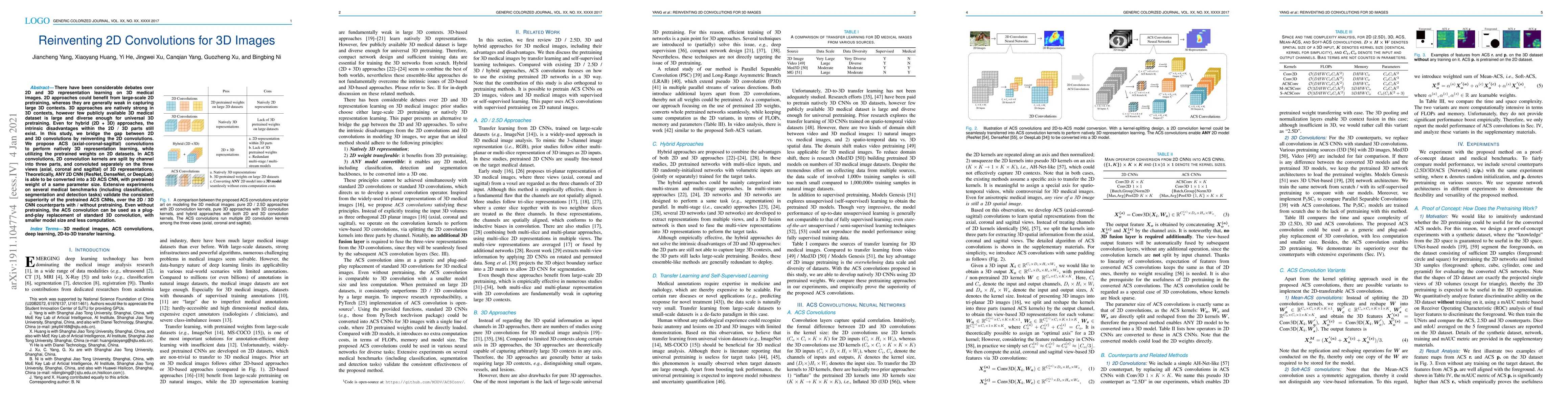 This paper proposes ACS convolutions to bridge the gap between 2D and 3D representation learning for 3D medical images. By splitting 2D convolution kernels into three parts and convolving them separately on axial, coronal, and sagittal views, the method allows any 2D CNN to be converted into a 3D ACS CNN with pretrained weights, achieving superior performance in medical benchmarks.