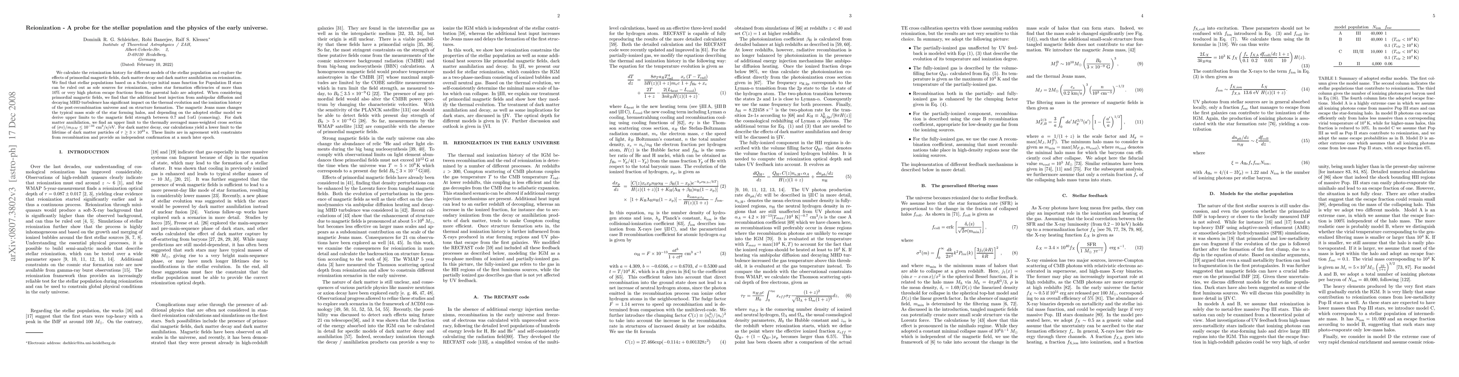 We calculate the reionization history for different models of the stellar population and explore the effects of primordial magnetic fields, dark matter decay and dark matter annihilation on reionization. We find that stellar populations based on a Scalo-type initial mass function for Population II stars can be ruled out as sole sources for reionization, unless star formation efficiencies of more than 10% or very high photon escape fractions from the parental halo are adopted. When considering primordial magnetic fields, we find that the additional heat injection from ambipolar diffusion and decaying MHD turbulence has significant impact on the thermal evolution and the ionization history of the post-recombination universe and on structure formation. The magnetic Jeans mass changes the typical mass scale of the star forming halos, and depending on the adopted stellar model we derive upper limits to the magnetic field strength between 0.7 and $5 $nG (comoving). For dark matter annihilation, we find an upper limit to the thermally averaged mass-weighted cross section of $10^{-33} \mathrm{cm}^3\mathrm{/s/eV}$. For dark matter decay, our calculations yield a lower limit to the lifetime of dark matter particles of $3\times10^{23}$ s. These limits are in agreement with constraints from recombination and the X-ray background and provide an independent confirmation at a much later epoch.