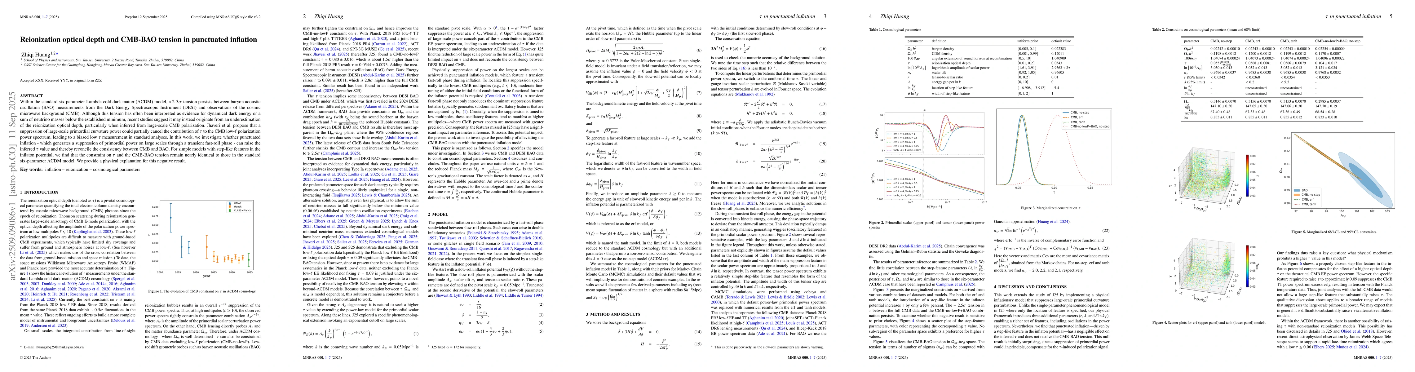 Within the standard six-parameter Lambda cold dark matter ($\Lambda$CDM) model, a $2$-$3\sigma$ tension persists between baryon acoustic oscillation (BAO) measurements from the Dark Energy Spectroscopic Instrument (DESI) and observations of the cosmic microwave background (CMB). Although this tension has often been interpreted as evidence for dynamical dark energy or a sum of neutrino masses below the established minimum, recent studies suggest it may instead originate from an underestimation of the reionization optical depth, particularly when inferred from large-scale CMB polarization. Jhaveri et al. propose that a suppression of large-scale primordial curvature power could partially cancel the contribution of $\tau$ to the CMB low-$\ell$ polarization power spectrum, leading to a biased low $\tau$ measurement in standard analyses. In this work, we investigate whether punctuated inflation - which generates a suppression of primordial power on large scales through a transient fast-roll phase - can raise the inferred $\tau$ value and thereby reconcile the consistency between CMB and BAO. For simple models with step-like features in the inflaton potential, we find that the constraint on $\tau$ and the CMB-BAO tension remain nearly identical to those in the standard six-parameter $\Lambda$CDM model. We provide a physical explanation for this negative result.