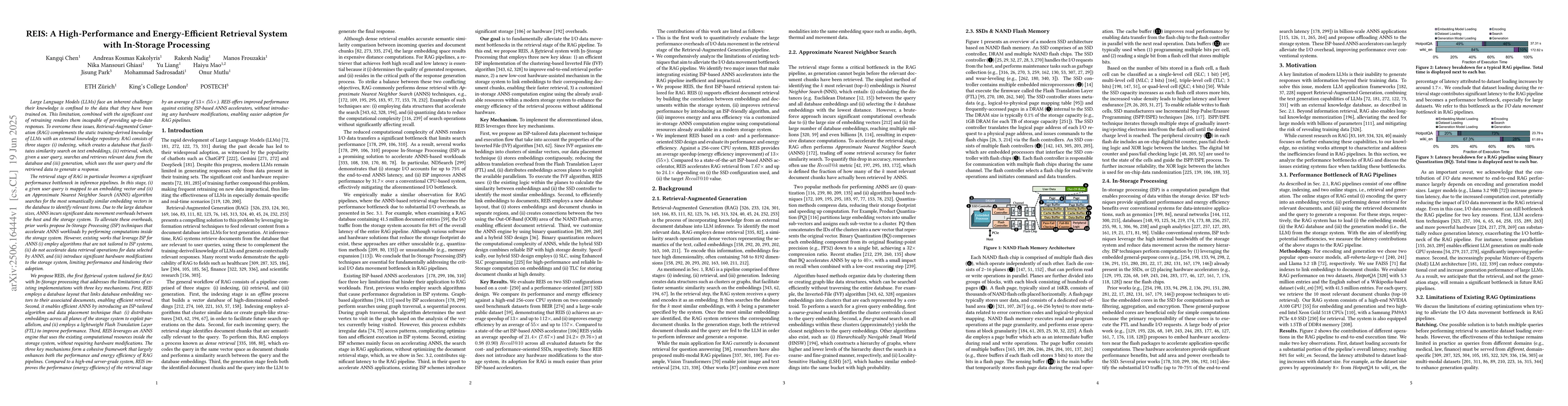 REIS is the first ISP system tailored for RAG, employing a database layout linking embedding vectors to associated documents, an ISP-tailored data placement technique, and an ANNS engine leveraging existing computational resources inside the storage system.