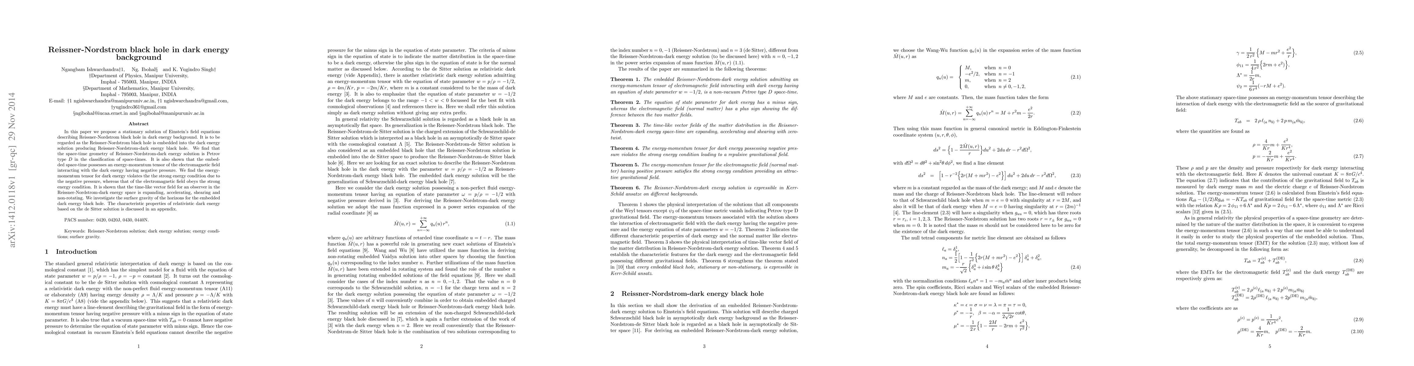 This paper proposes a stationary solution for a Reissner-Nordstrom black hole in a dark energy background, classifying its spacetime geometry as Petrov type D. It explores the interaction between the electromagnetic field and dark energy, revealing that the dark energy violates the strong energy condition due to negative pressure.
