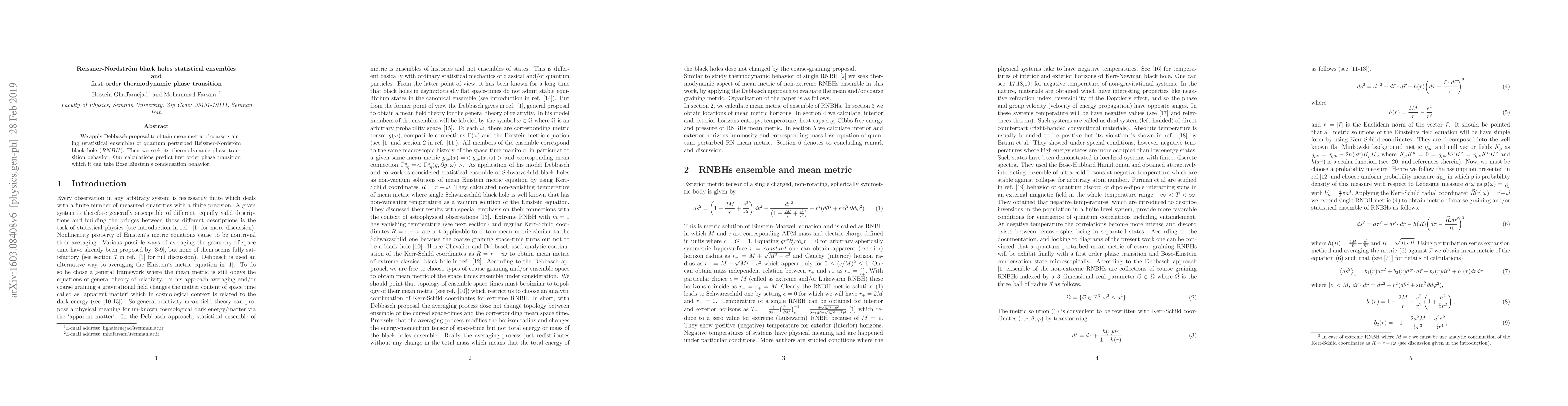 This paper investigates the statistical ensemble of quantum-perturbed Reissner-Nordström black holes using Debbasch's proposal to derive the mean metric. It finds a first-order thermodynamic phase transition with potential Bose-Einstein condensation behavior.