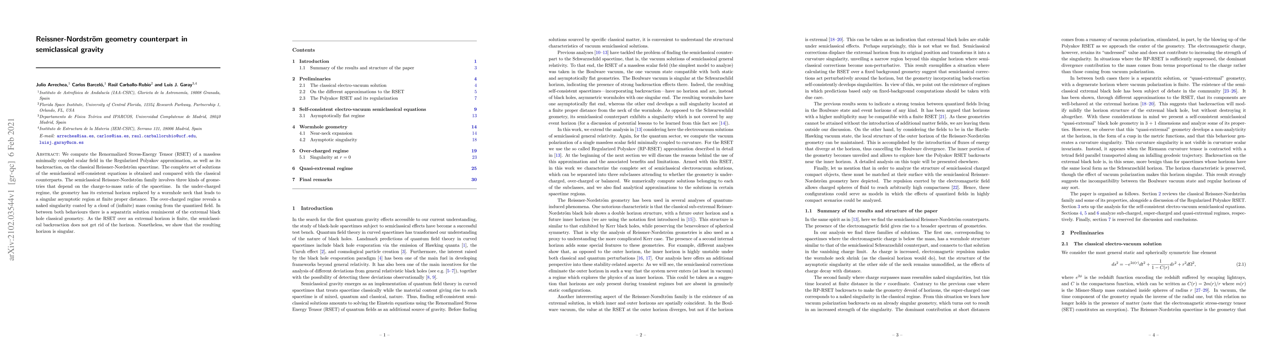 This paper computes the Renormalized Stress-Energy Tensor of a scalar field in semiclassical gravity on Reissner-Nordström spacetime, revealing three distinct geometries based on charge-to-mass ratios, with implications for horizons and singularities. The semiclassical backreaction maintains a singular horizon despite finite RSET over extremal horizons.