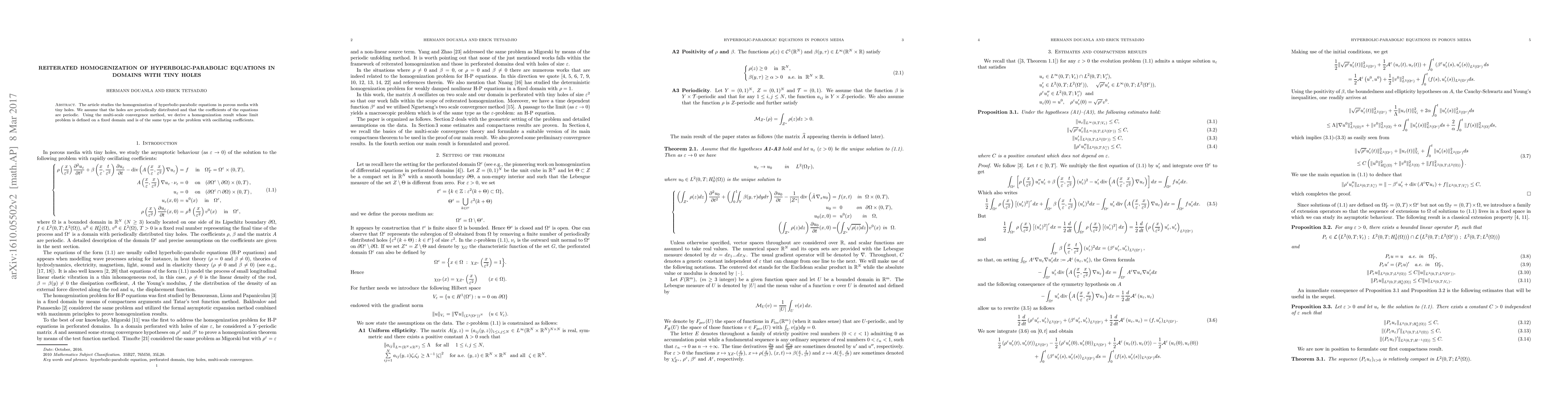 This paper investigates the homogenization of hyperbolic-parabolic equations in porous media featuring tiny, periodically distributed holes. The authors derive a homogenization result using the multi-scale convergence method, leading to a limit problem defined on a fixed domain.