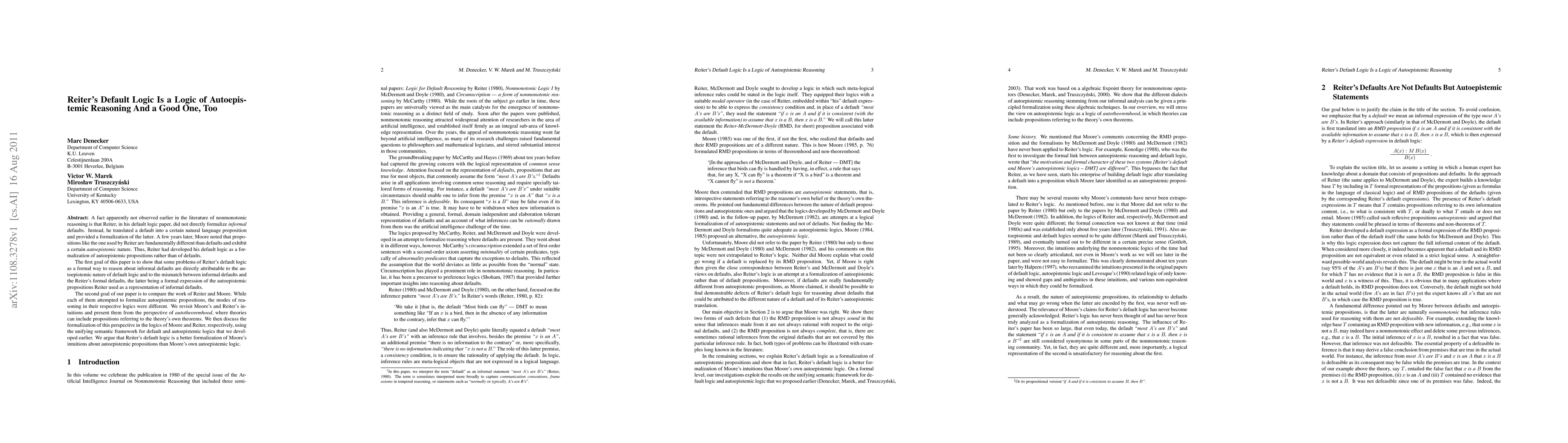 This paper explores how Reiter's default logic inadvertently formalizes autoepistemic reasoning rather than informal defaults, attributing some issues to this mismatch. It also compares Reiter's and Moore's approaches to autoepistemic propositions, arguing that Reiter's default logic better captures Moore's intuitions.