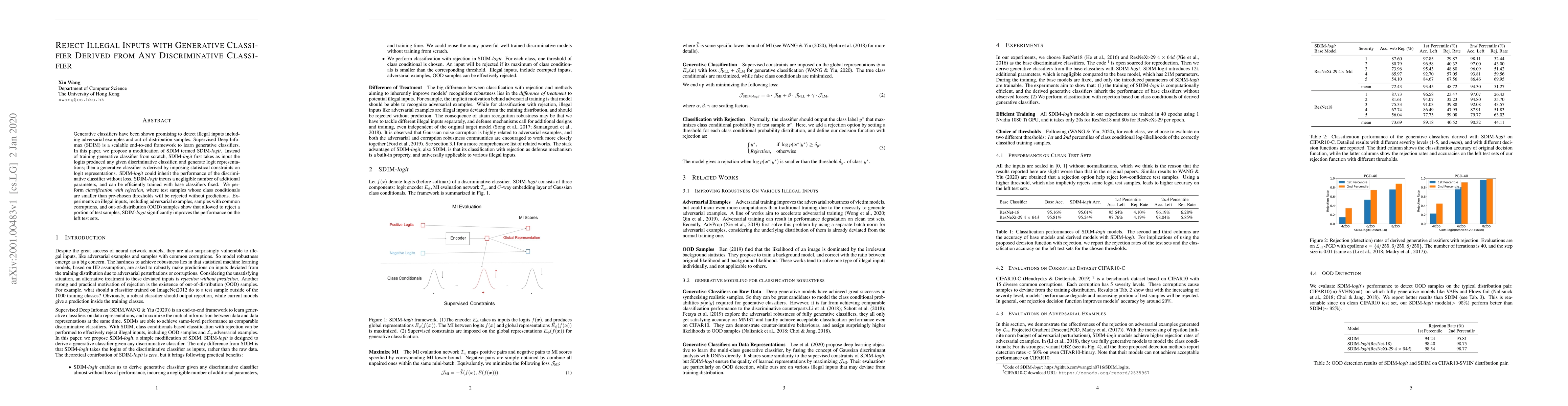 Generative classifiers have been shown promising to detect illegal inputs including adversarial examples and out-of-distribution samples. Supervised Deep Infomax~(SDIM) is a scalable end-to-end framework to learn generative classifiers. In this paper, we propose a modification of SDIM termed SDIM-\emph{logit}. Instead of training generative classifier from scratch, SDIM-\emph{logit} first takes as input the logits produced any given discriminative classifier, and generate logit representations; then a generative classifier is derived by imposing statistical constraints on logit representations. SDIM-\emph{logit} could inherit the performance of the discriminative classifier without loss. SDIM-\emph{logit} incurs a negligible number of additional parameters, and can be efficiently trained with base classifiers fixed. We perform \emph{classification with rejection}, where test samples whose class conditionals are smaller than pre-chosen thresholds will be rejected without predictions. Experiments on illegal inputs, including adversarial examples, samples with common corruptions, and out-of-distribution~(OOD) samples show that allowed to reject a portion of test samples, SDIM-\emph{logit} significantly improves the performance on the left test sets.