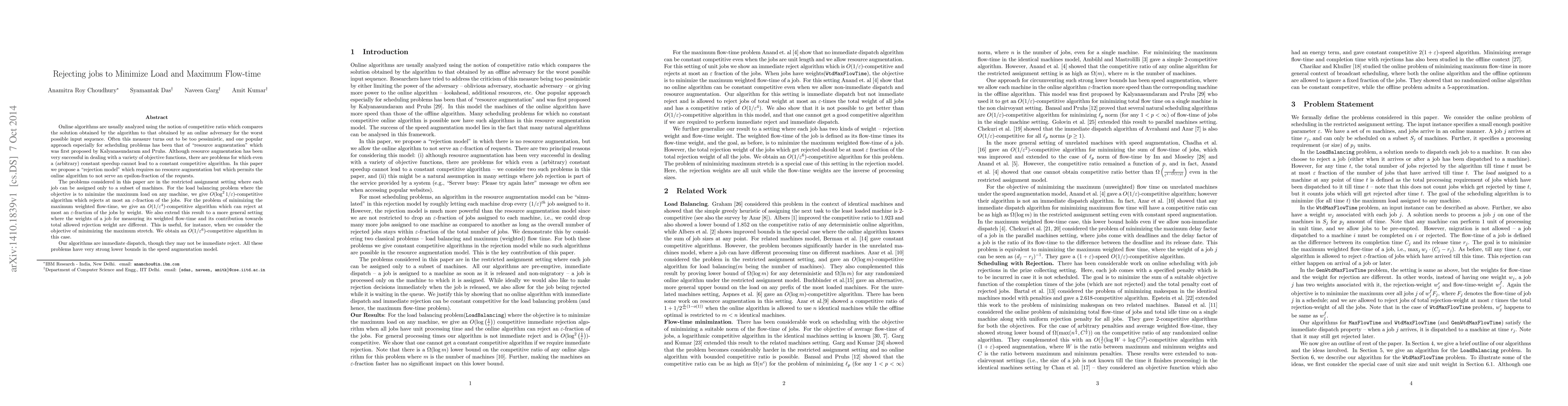 Online algorithms are usually analyzed using the notion of competitive ratio which compares the solution obtained by the algorithm to that obtained by an online adversary for the worst possible input sequence. Often this measure turns out to be too pessimistic, and one popular approach especially for scheduling problems has been that of "resource augmentation" which was first proposed by Kalyanasundaram and Pruhs. Although resource augmentation has been very successful in dealing with a variety of objective functions, there are problems for which even a (arbitrary) constant speedup cannot lead to a constant competitive algorithm. In this paper we propose a "rejection model" which requires no resource augmentation but which permits the online algorithm to not serve an epsilon-fraction of the requests. The problems considered in this paper are in the restricted assignment setting where each job can be assigned only to a subset of machines. For the load balancing problem where the objective is to minimize the maximum load on any machine, we give $O(\log^2 1/\eps)$-competitive algorithm which rejects at most an $\eps$-fraction of the jobs. For the problem of minimizing the maximum weighted flow-time, we give an $O(1/\eps^4)$-competitive algorithm which can reject at most an $\eps$-fraction of the jobs by weight. We also extend this result to a more general setting where the weights of a job for measuring its weighted flow-time and its contribution towards total allowed rejection weight are different. This is useful, for instance, when we consider the objective of minimizing the maximum stretch. We obtain an $O(1/\eps^6)$-competitive algorithm in this case. Our algorithms are immediate dispatch, though they may not be immediate reject. All these problems have very strong lower bounds in the speed augmentation model.