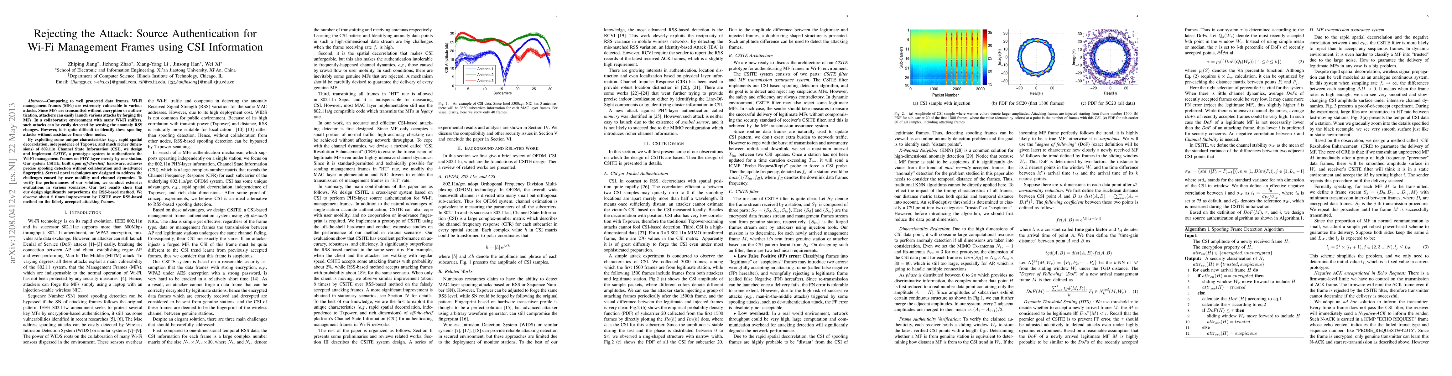 Comparing to well protected data frames, Wi-Fi management frames (MFs) are extremely vulnerable to various attacks. Since MFs are transmitted without encryption, attackers can forge them easily. Such attacks can be detected in cooperative environment such as Wireless Intrusion Detection System (WIDS). However, in non-cooperative environment it is difficult for a single station to identify these spoofing attacks using Received Signal Strength (RSS)-based detection, due to the strong correlation of RSS to both the transmission power (Txpower) and the location of the sender. By exploiting some unique characteristics (i.e., rapid spatial decorrelation, independence of Txpower, and much richer dimensions) of the Channel State Information (CSI), a standard feature in 802.11n Specification, we design a prototype, called CSITE, to authenticate the Wi-Fi management frames by a single station without external support. Our design CSITE, built upon off-the-shelf hardware, achieves precise spoofing detection without collaboration and in-advance finger-print. Several novel techniques are designed to address the challenges caused by user mobility and channel dynamics. To verify the performances of our solution, we implement a prototype of our design and conduct extensive evaluations in various scenarios. Our test results show that our design significantly outperforms the RSS-based method in terms of accuracy, robustness, and efficiency: we observe about 8 times improvement by CSITE over RSS-based method on the falsely accepted attacking frames.