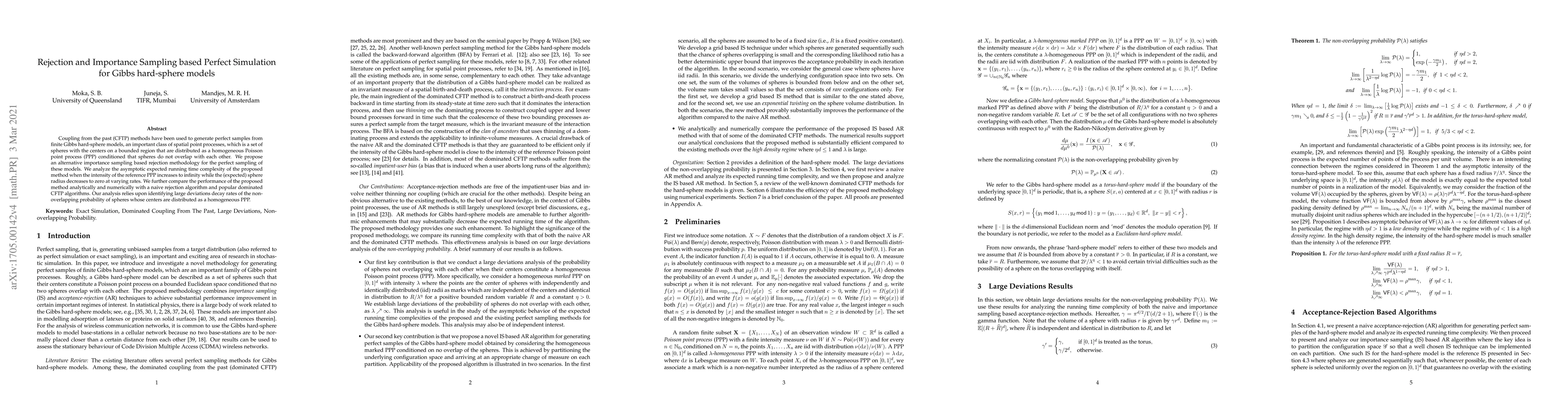 This paper proposes an importance sampling-based rejection method for perfect sampling of Gibbs hard-sphere models, comparing its performance analytically and numerically to existing coupling from the past and naive rejection algorithms. The study focuses on the asymptotic running time complexity as the reference Poisson point process intensity increases.