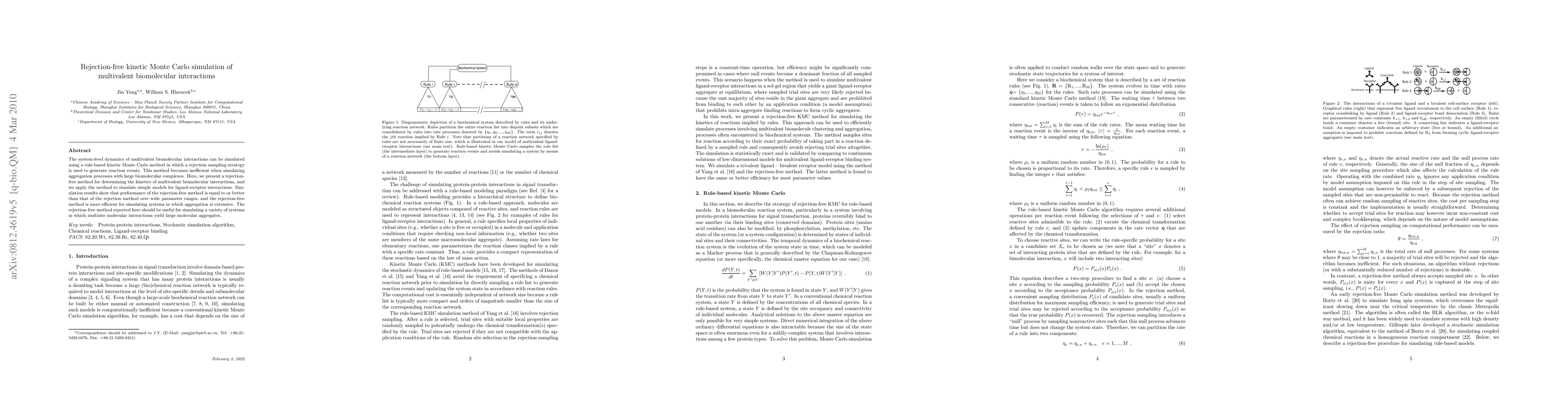 This paper introduces a rejection-free kinetic Monte Carlo method for simulating multivalent biomolecular interactions, demonstrating its efficiency over traditional rejection methods, especially for extensive aggregation processes. The new method shows comparable or superior performance across a range of parameters, making it suitable for modeling large molecular aggregates.