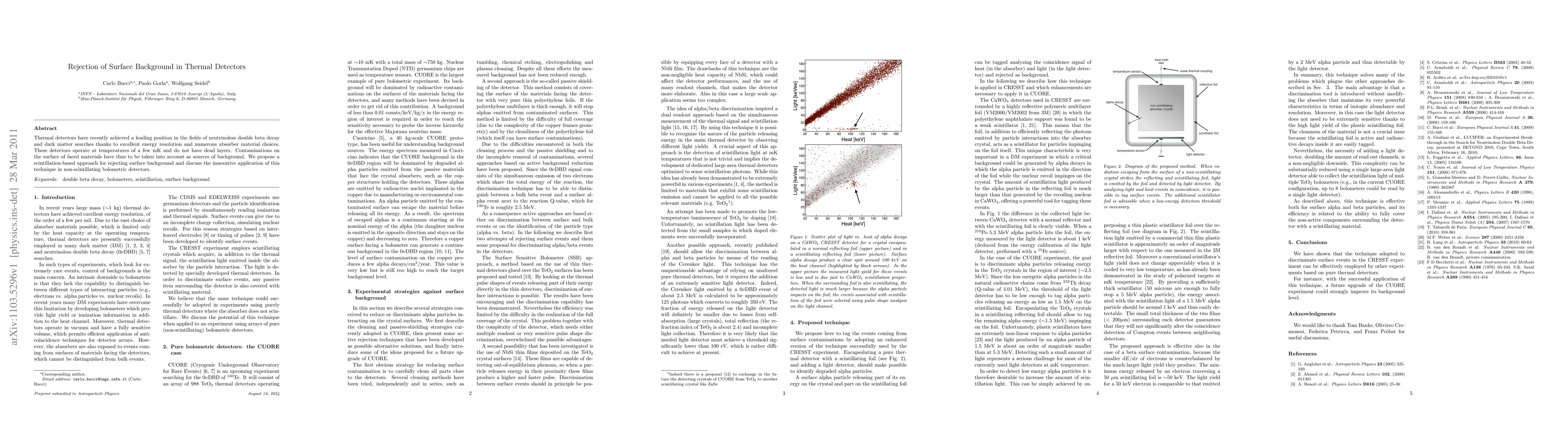 This paper proposes a scintillation-based method to reject surface background contamination in thermal detectors used in neutrinoless double beta decay and dark matter searches, emphasizing its application in non-scintillating bolometric detectors to enhance their performance.