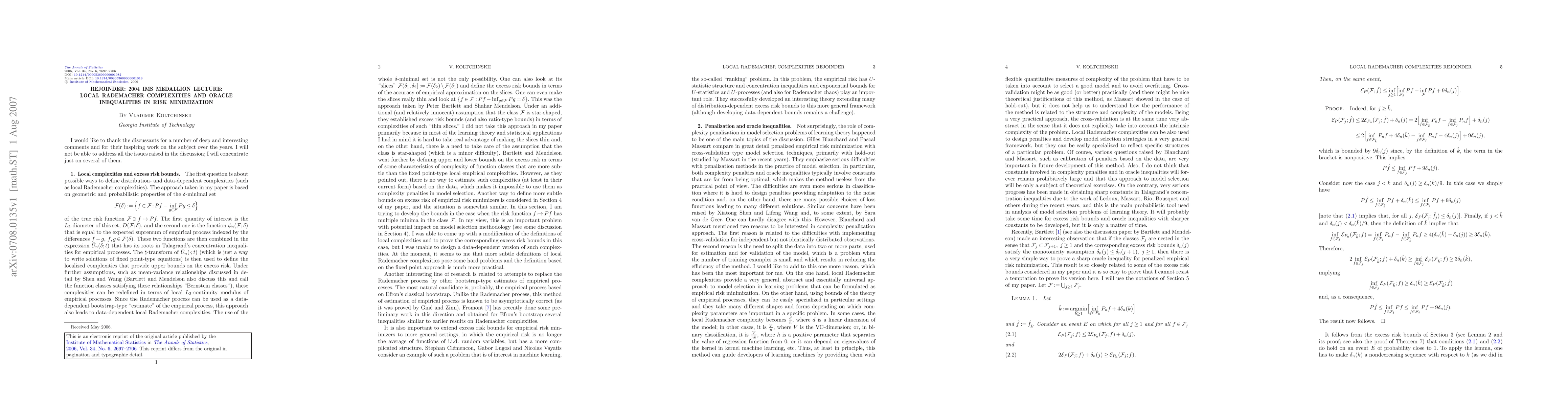 This rejoinder discusses the 2004 IMS Medallion Lecture on local Rademacher complexities and their application to oracle inequalities in risk minimization, emphasizing the importance of these concepts in understanding generalization bounds in statistical learning theory. The author addresses critiques and further elaborates on the theoretical underpinnings and practical implications of the discussed methodologies.