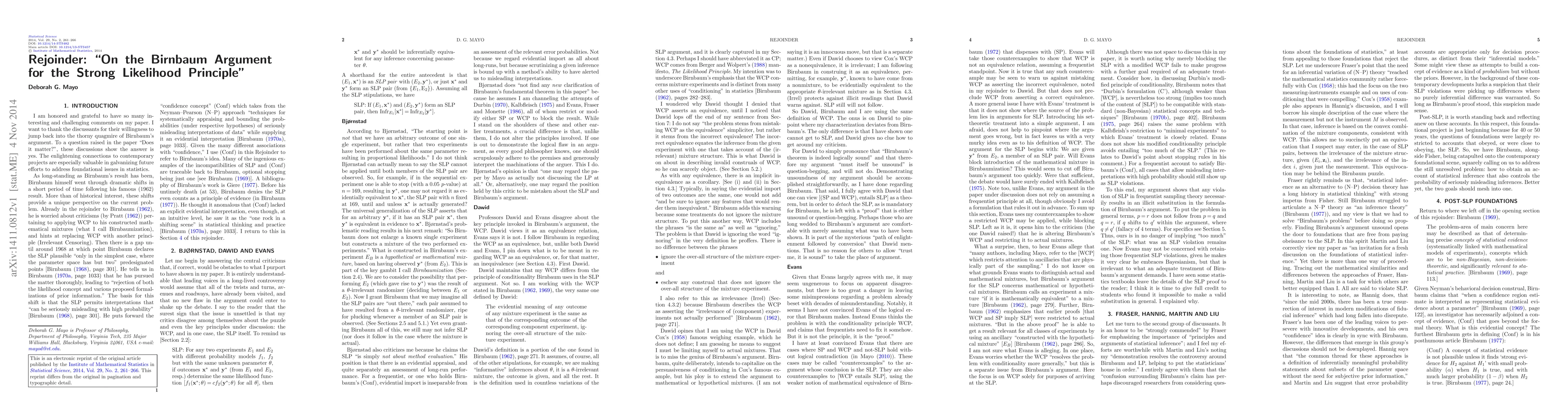 This rejoinder addresses Deborah G. Mayo's critique of Birnbaum's argument for the strong likelihood principle, defending the principle's validity and responding to Mayo's objections with a detailed analysis of the underlying statistical concepts. The author reaffirms the importance of the likelihood principle in statistical inference.