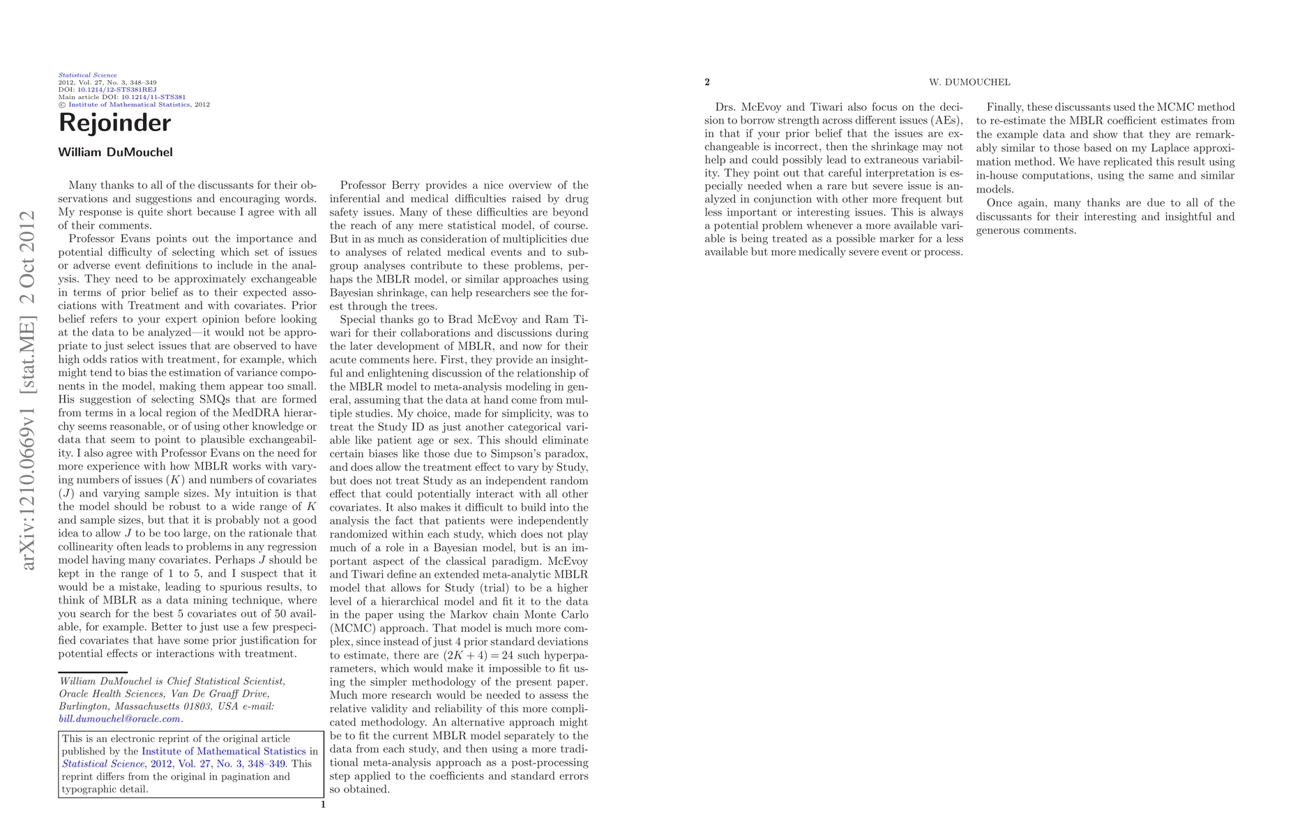 Rejoinder to "Multivariate Bayesian Logistic Regression for Analysis of Clinical Trial Safety Issues" by W. DuMouchel [arXiv:1210.0385].