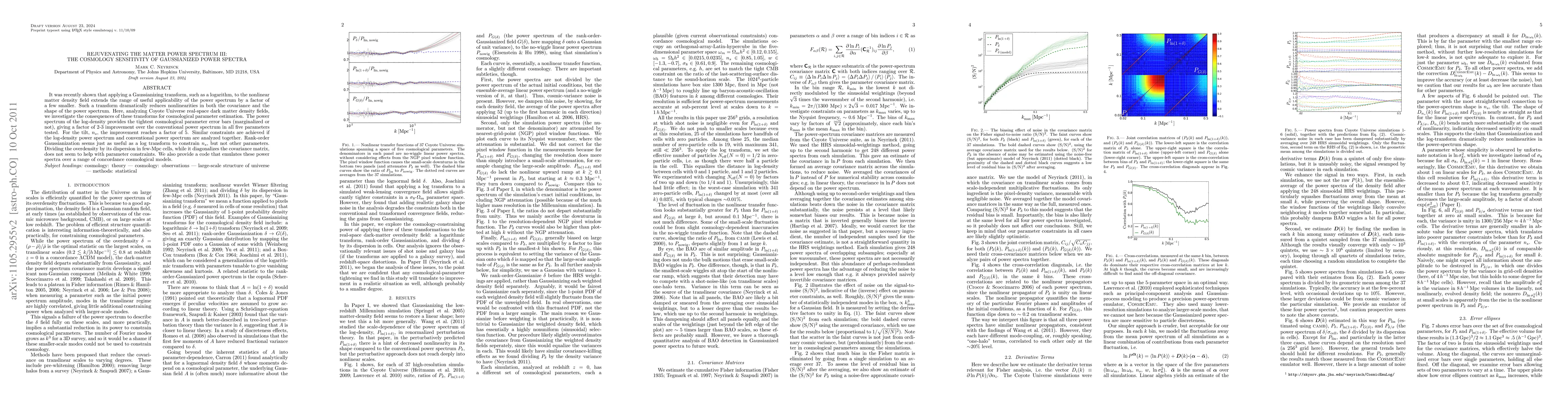 This paper investigates the impact of Gaussianizing transforms, like the logarithm, on the matter power spectrum for cosmological parameter estimation. The log-density power spectrum provides tighter error bars, improving constraints by a factor of 2-3 for most parameters, and up to 5 times for the spectral tilt, n_s.