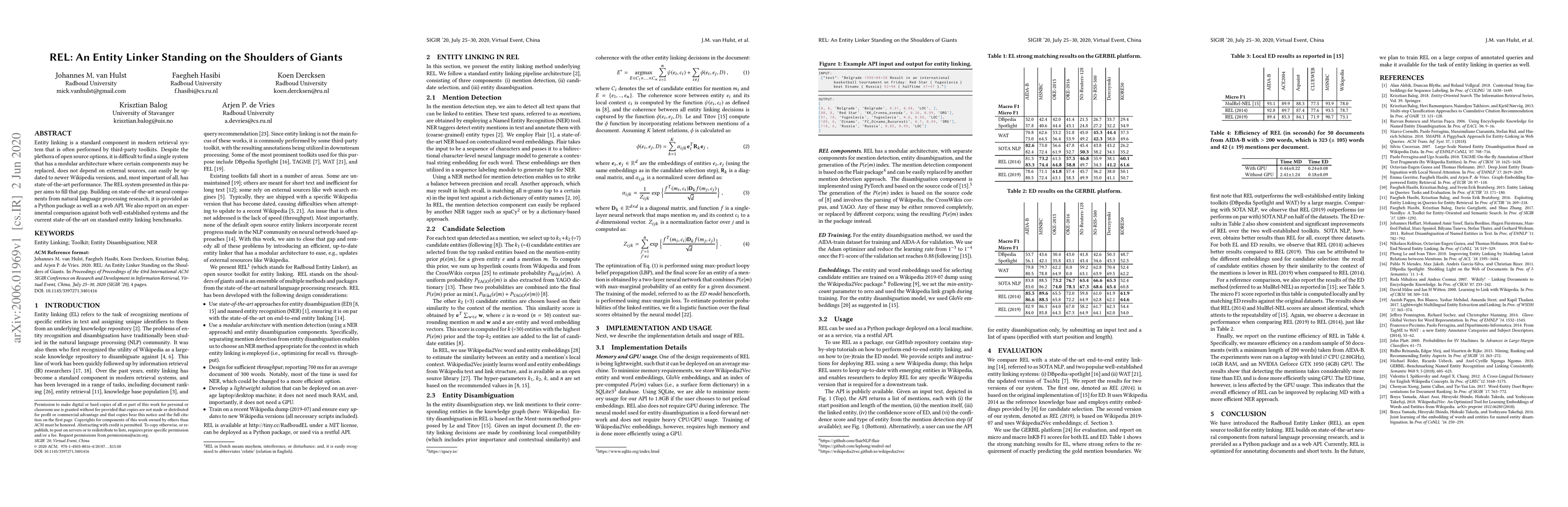 Entity linking is a standard component in modern retrieval system that is often performed by third-party toolkits. Despite the plethora of open source options, it is difficult to find a single system that has a modular architecture where certain components may be replaced, does not depend on external sources, can easily be updated to newer Wikipedia versions, and, most important of all, has state-of-the-art performance. The REL system presented in this paper aims to fill that gap. Building on state-of-the-art neural components from natural language processing research, it is provided as a Python package as well as a web API. We also report on an experimental comparison against both well-established systems and the current state-of-the-art on standard entity linking benchmarks.