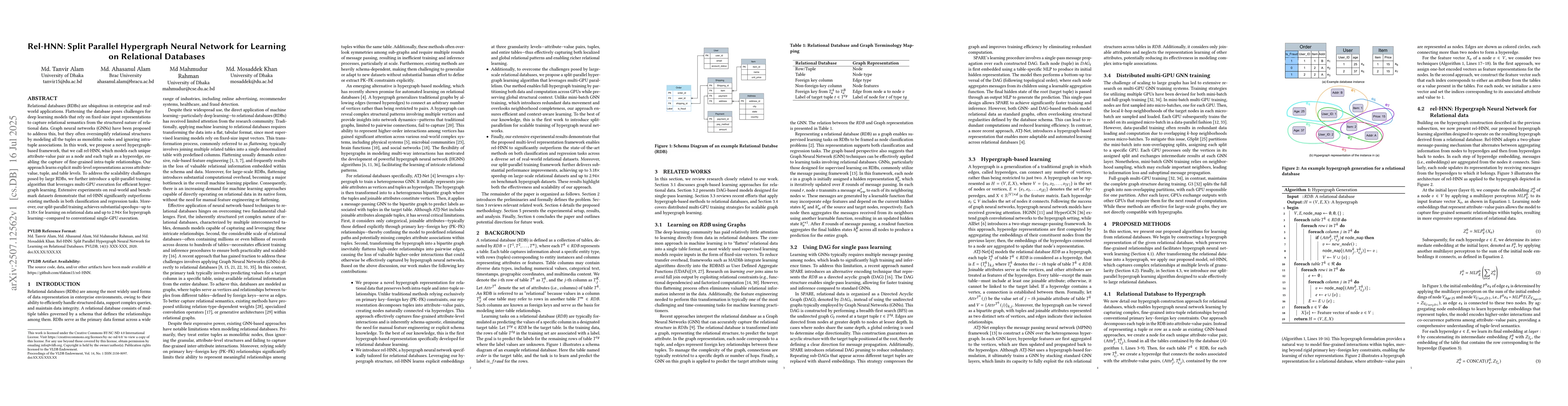 Relational databases (RDBs) are ubiquitous in enterprise and real-world applications. Flattening the database poses challenges for deep learning models that rely on fixed-size input representations to capture relational semantics from the structured nature of relational data. Graph neural networks (GNNs) have been proposed to address this, but they often oversimplify relational structures by modeling all the tuples as monolithic nodes and ignoring intra-tuple associations. In this work, we propose a novel hypergraph-based framework, that we call rel-HNN, which models each unique attribute-value pair as a node and each tuple as a hyperedge, enabling the capture of fine-grained intra-tuple relationships. Our approach learns explicit multi-level representations across attribute-value, tuple, and table levels. To address the scalability challenges posed by large RDBs, we further introduce a split-parallel training algorithm that leverages multi-GPU execution for efficient hypergraph learning. Extensive experiments on real-world and benchmark datasets demonstrate that rel-HNN significantly outperforms existing methods in both classification and regression tasks. Moreover, our split-parallel training achieves substantial speedups -- up to 3.18x for learning on relational data and up to 2.94x for hypergraph learning -- compared to conventional single-GPU execution.