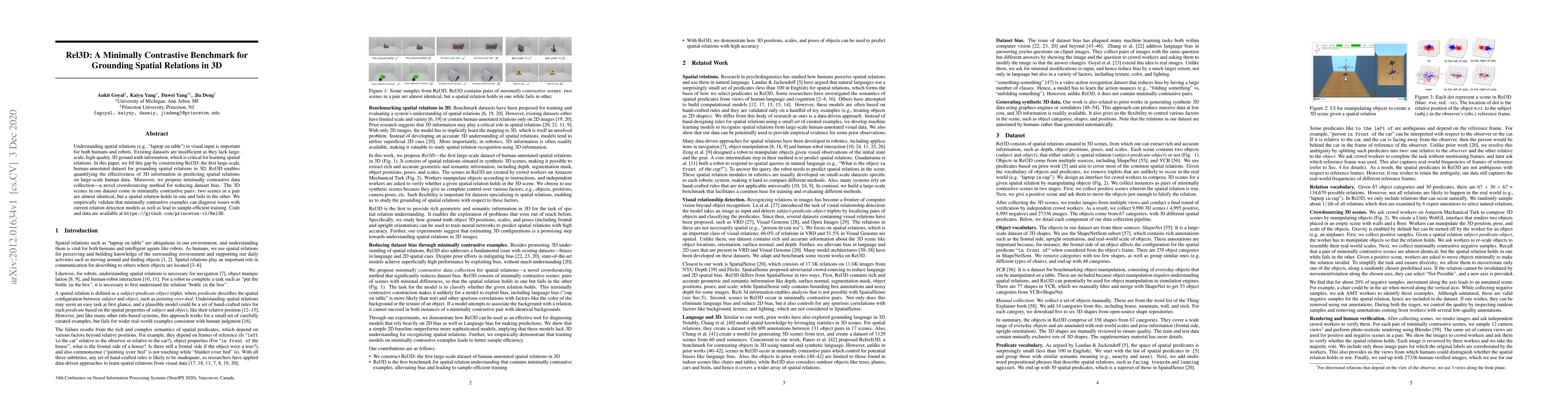 Understanding spatial relations (e.g., "laptop on table") in visual input is important for both humans and robots. Existing datasets are insufficient as they lack large-scale, high-quality 3D ground truth information, which is critical for learning spatial relations. In this paper, we fill this gap by constructing Rel3D: the first large-scale, human-annotated dataset for grounding spatial relations in 3D. Rel3D enables quantifying the effectiveness of 3D information in predicting spatial relations on large-scale human data. Moreover, we propose minimally contrastive data collection -- a novel crowdsourcing method for reducing dataset bias. The 3D scenes in our dataset come in minimally contrastive pairs: two scenes in a pair are almost identical, but a spatial relation holds in one and fails in the other. We empirically validate that minimally contrastive examples can diagnose issues with current relation detection models as well as lead to sample-efficient training. Code and data are available at https://github.com/princeton-vl/Rel3D.