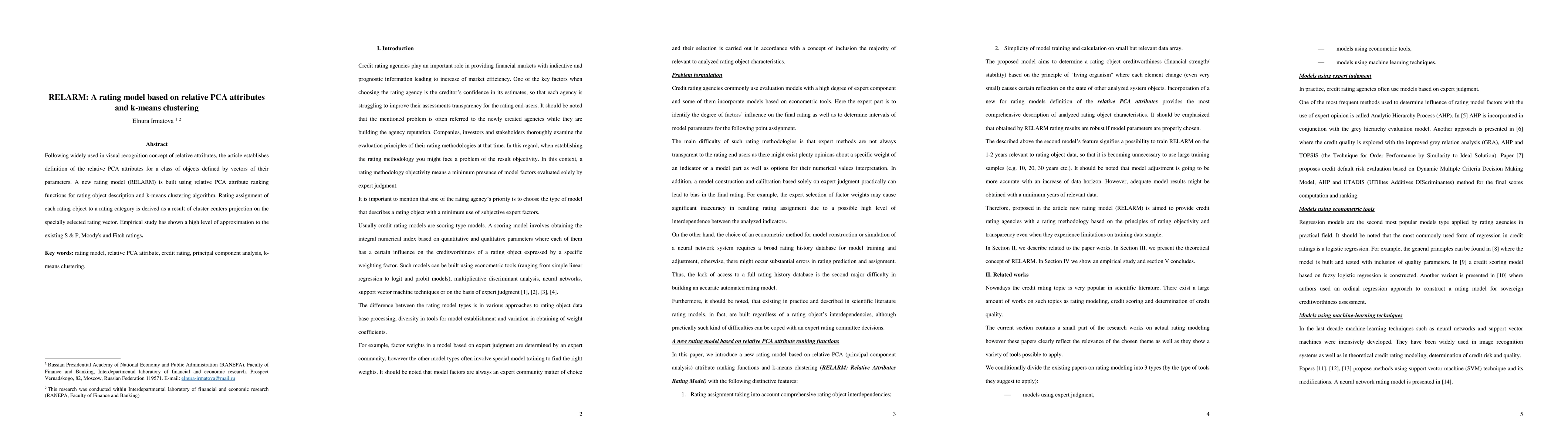 Following widely used in visual recognition concept of relative attributes, the article establishes definition of the relative PCA attributes for a class of objects defined by vectors of their parameters. A new rating model (RELARM) is built using relative PCA attribute ranking functions for rating object description and k-means clustering algorithm. Rating assignment of each rating object to a rating category is derived as a result of cluster centers projection on the specially selected rating vector. Empirical study has shown a high level of approximation to the existing S & P, Moody's and Fitch ratings.