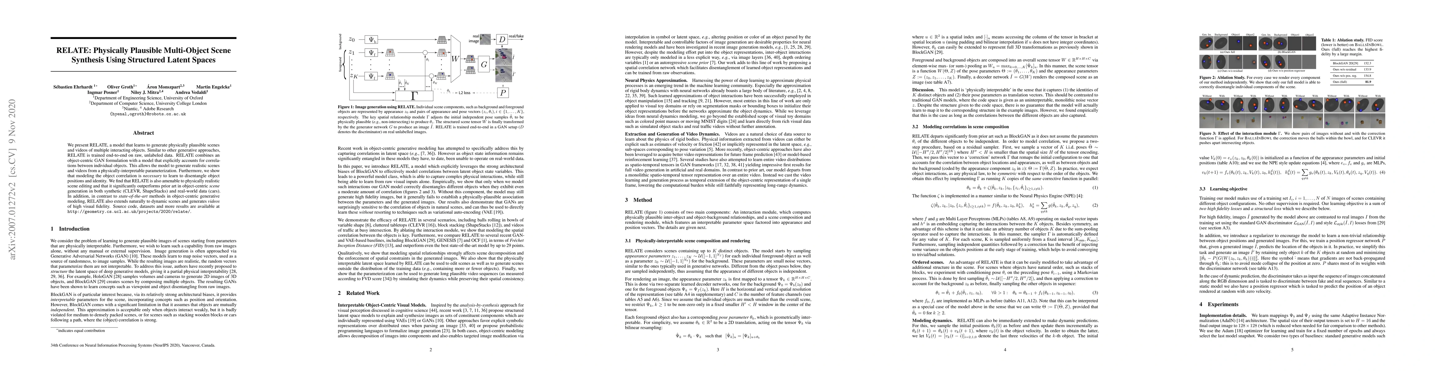 RELATE is a generative model that synthesizes physically plausible multi-object scenes and videos by learning correlations between objects, outperforming prior methods in both synthetic and real-world data. It combines object-centric GANs with explicit modeling of object interactions for realistic scene editing and dynamic scene generation.