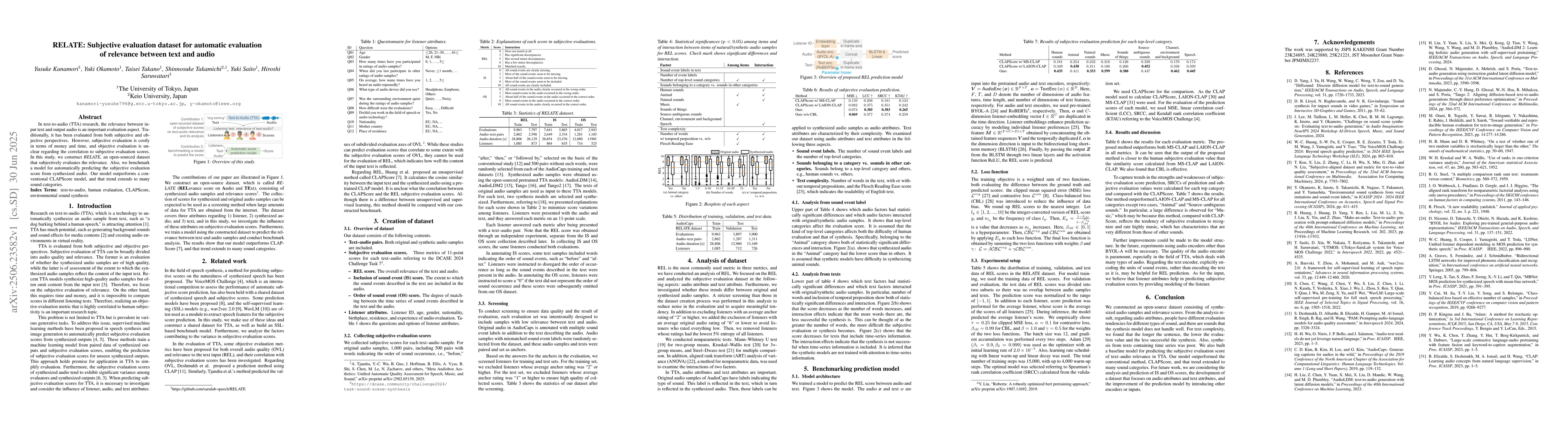 In text-to-audio (TTA) research, the relevance between input text and output audio is an important evaluation aspect. Traditionally, it has been evaluated from both subjective and objective perspectives. However, subjective evaluation is costly in terms of money and time, and objective evaluation is unclear regarding the correlation to subjective evaluation scores. In this study, we construct RELATE, an open-sourced dataset that subjectively evaluates the relevance. Also, we benchmark a model for automatically predicting the subjective evaluation score from synthesized audio. Our model outperforms a conventional CLAPScore model, and that trend extends to many sound categories.