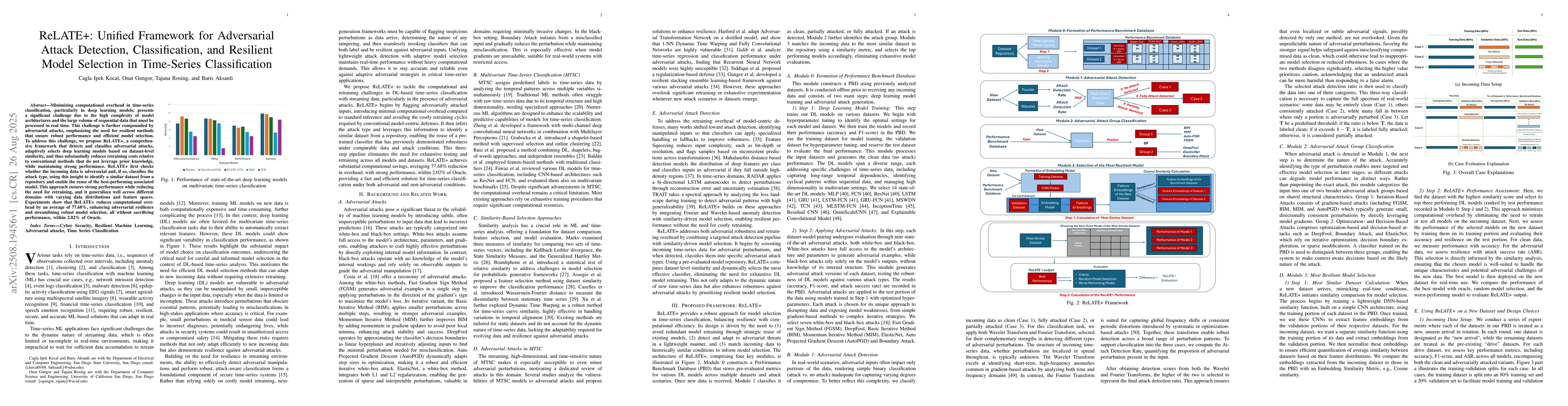 Minimizing computational overhead in time-series classification, particularly in deep learning models, presents a significant challenge due to the high complexity of model architectures and the large volume of sequential data that must be processed in real time. This challenge is further compounded by adversarial attacks, emphasizing the need for resilient methods that ensure robust performance and efficient model selection. To address this challenge, we propose ReLATE+, a comprehensive framework that detects and classifies adversarial attacks, adaptively selects deep learning models based on dataset-level similarity, and thus substantially reduces retraining costs relative to conventional methods that do not leverage prior knowledge, while maintaining strong performance. ReLATE+ first checks whether the incoming data is adversarial and, if so, classifies the attack type, using this insight to identify a similar dataset from a repository and enable the reuse of the best-performing associated model. This approach ensures strong performance while reducing the need for retraining, and it generalizes well across different domains with varying data distributions and feature spaces. Experiments show that ReLATE+ reduces computational overhead by an average of 77.68%, enhancing adversarial resilience and streamlining robust model selection, all without sacrificing performance, within 2.02% of Oracle.