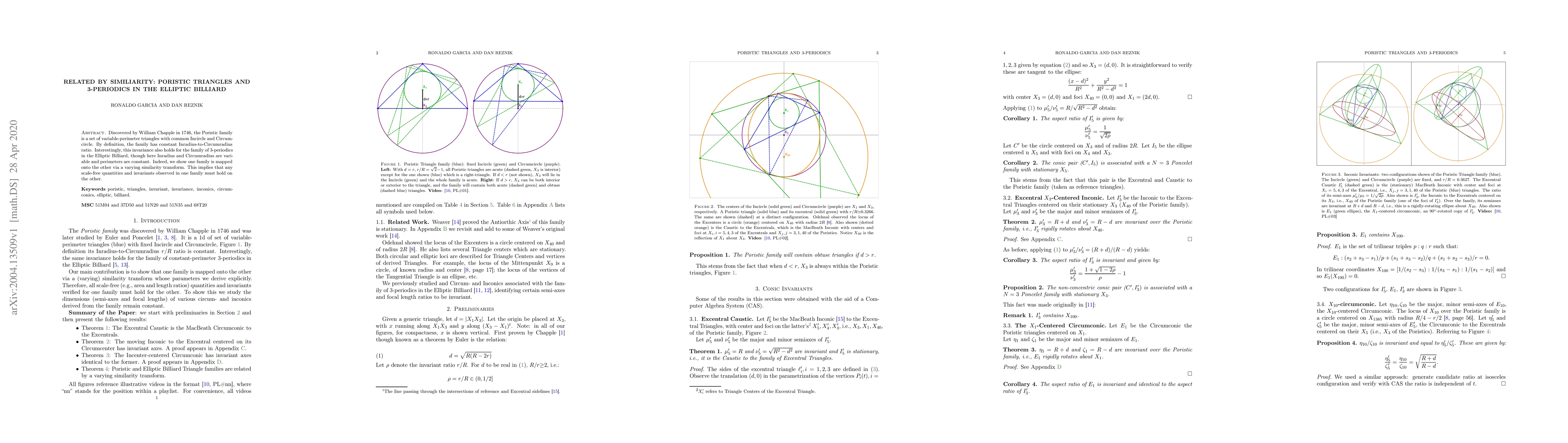 Summary: This paper explores the similarity between Poristic triangles and 3-periodic orbits in the elliptic billiard, demonstrating that both families share a constant Inradius-to-Circumradius ratio, and that one can be mapped onto the other via a similarity transform, indicating shared scale-free invariants.