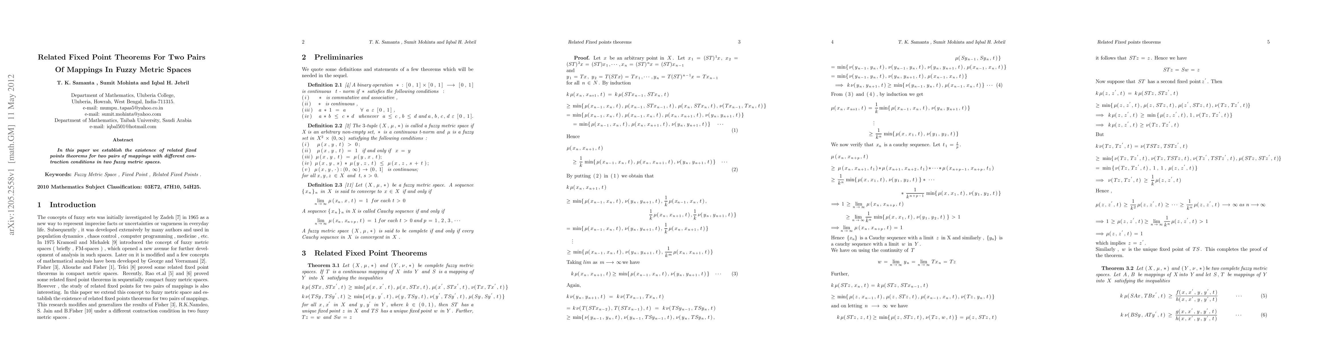 This paper establishes fixed point theorems for two pairs of mappings in fuzzy metric spaces with different contraction conditions, expanding our understanding of mapping theory in these spaces.