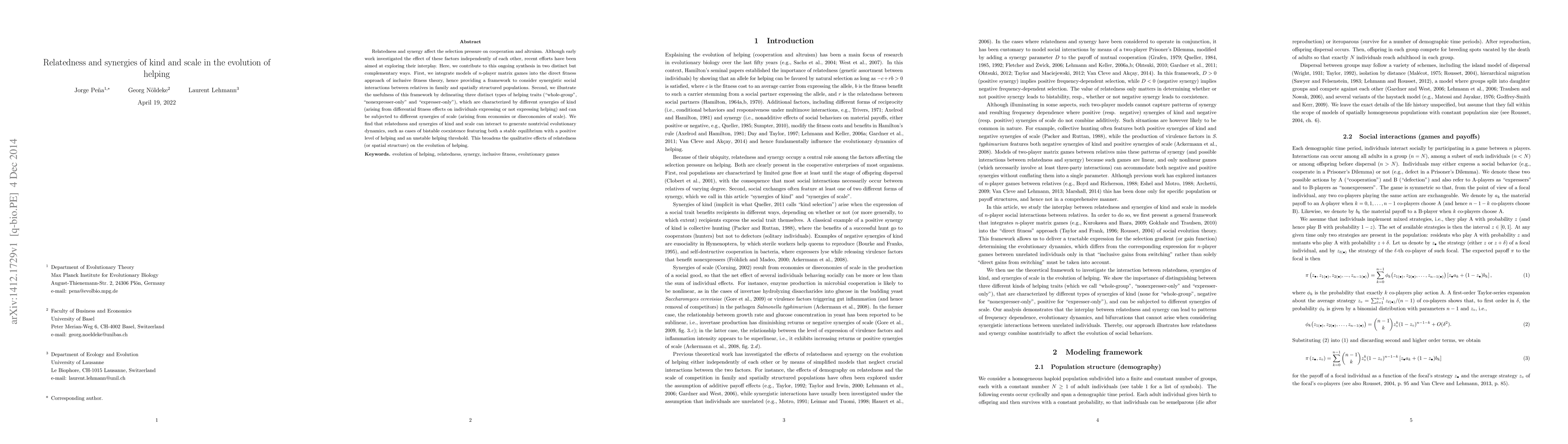 Relatedness and synergy affect the selection pressure on cooperation and altruism. Although early work investigated the effect of these factors independently of each other, recent efforts have been aimed at exploring their interplay. Here, we contribute to this ongoing synthesis in two distinct but complementary ways. First, we integrate models of $n$-player matrix games into the direct fitness approach of inclusive fitness theory, hence providing a framework to consider synergistic social interactions between relatives in family and spatially structured populations. Second, we illustrate the usefulness of this framework by delineating three distinct types of helping traits ("whole-group", "nonexpresser-only" and "expresser-only"), which are characterized by different synergies of kind (arising from differential fitness effects on individuals expressing or not expressing helping) and can be subjected to different synergies of scale (arising from economies or diseconomies of scale). We find that relatedness and synergies of kind and scale can interact to generate nontrivial evolutionary dynamics, such as cases of bistable coexistence featuring both a stable equilibrium with a positive level of helping and an unstable helping threshold. This broadens the qualitative effects of relatedness (or spatial structure) on the evolution of helping.