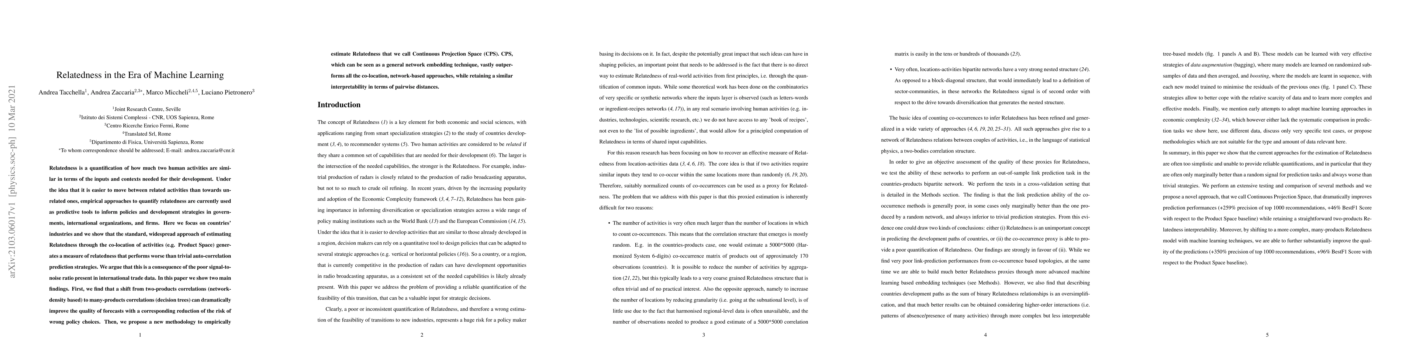 Relatedness is a quantification of how much two human activities are similar in terms of the inputs and contexts needed for their development. Under the idea that it is easier to move between related activities than towards unrelated ones, empirical approaches to quantify relatedness are currently used as predictive tools to inform policies and development strategies in governments, international organizations, and firms. Here we focus on countries' industries and we show that the standard, widespread approach of estimating Relatedness through the co-location of activities (e.g. Product Space) generates a measure of relatedness that performs worse than trivial auto-correlation prediction strategies. We argue that this is a consequence of the poor signal-to-noise ratio present in international trade data. In this paper we show two main findings. First, we find that a shift from two-products correlations (network-density based) to many-products correlations (decision trees) can dramatically improve the quality of forecasts with a corresponding reduction of the risk of wrong policy choices. Then, we propose a new methodology to empirically estimate Relatedness that we call Continuous Projection Space (CPS). CPS, which can be seen as a general network embedding technique, vastly outperforms all the co-location, network-based approaches, while retaining a similar interpretability in terms of pairwise distances.