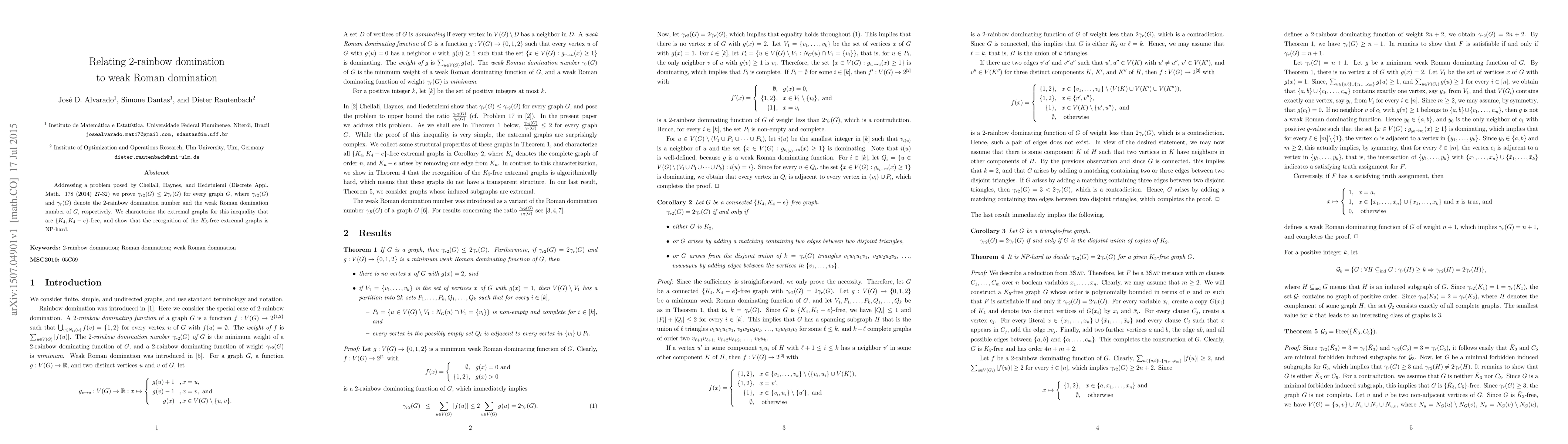 This paper proves the inequality $\gamma_{r2}(G)\leq 2\gamma_r(G)$ for any graph $G$, relating $2$-rainbow domination to weak Roman domination. It also characterizes $\{ K_4, K_4-e\}$-free extremal graphs and demonstrates the NP-hardness of recognizing $K_5$-free extremal graphs.