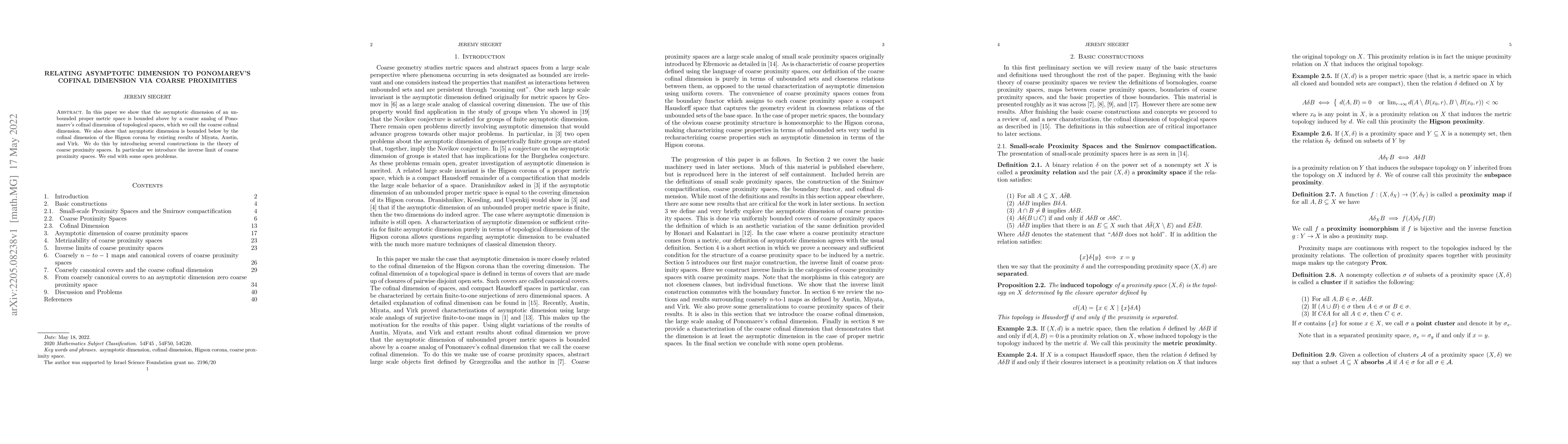 In this paper we show that the asymptotic dimension of an unbounded proper metric space is bounded above by a coarse analog of Ponomarev's cofinal dimension of topological spaces, which we call the coarse cofinal dimension. We also show that asymptotic dimension is bounded below by the cofinal dimension of the Higson corona by existing results of Miyata, Austin, and Virk. We do this by introducing several constructions in the theory of coarse proximity spaces. In particular we introduce the inverse limit of coarse proximity spaces. We end with some open problems.