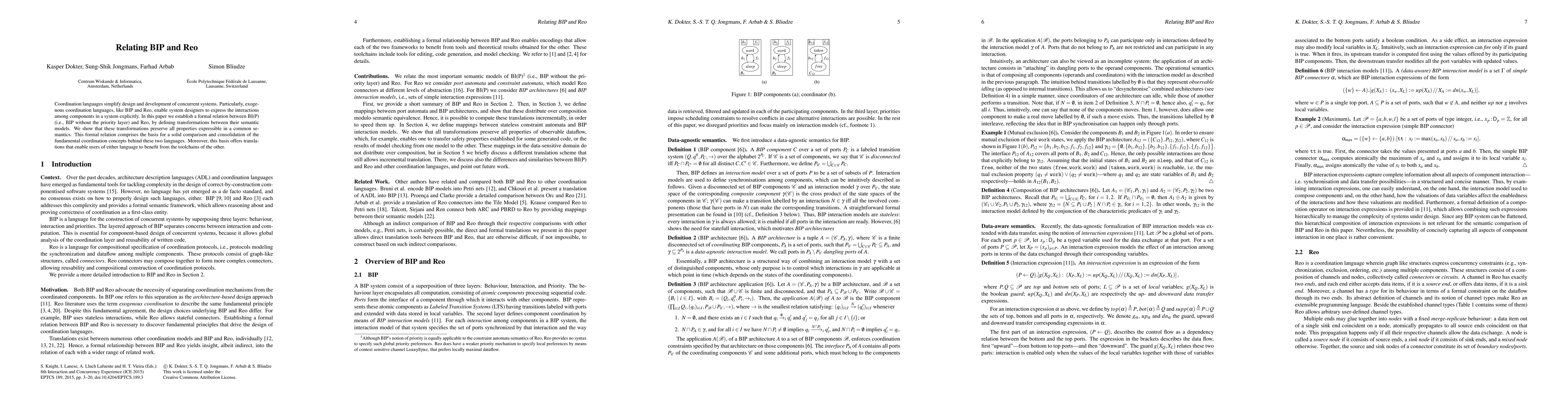 Coordination languages simplify design and development of concurrent systems. Particularly, exogenous coordination languages, like BIP and Reo, enable system designers to express the interactions among components in a system explicitly. In this paper we establish a formal relation between BI(P) (i.e., BIP without the priority layer) and Reo, by defining transformations between their semantic models. We show that these transformations preserve all properties expressible in a common semantics. This formal relation comprises the basis for a solid comparison and consolidation of the fundamental coordination concepts behind these two languages. Moreover, this basis offers translations that enable users of either language to benefit from the toolchains of the other.