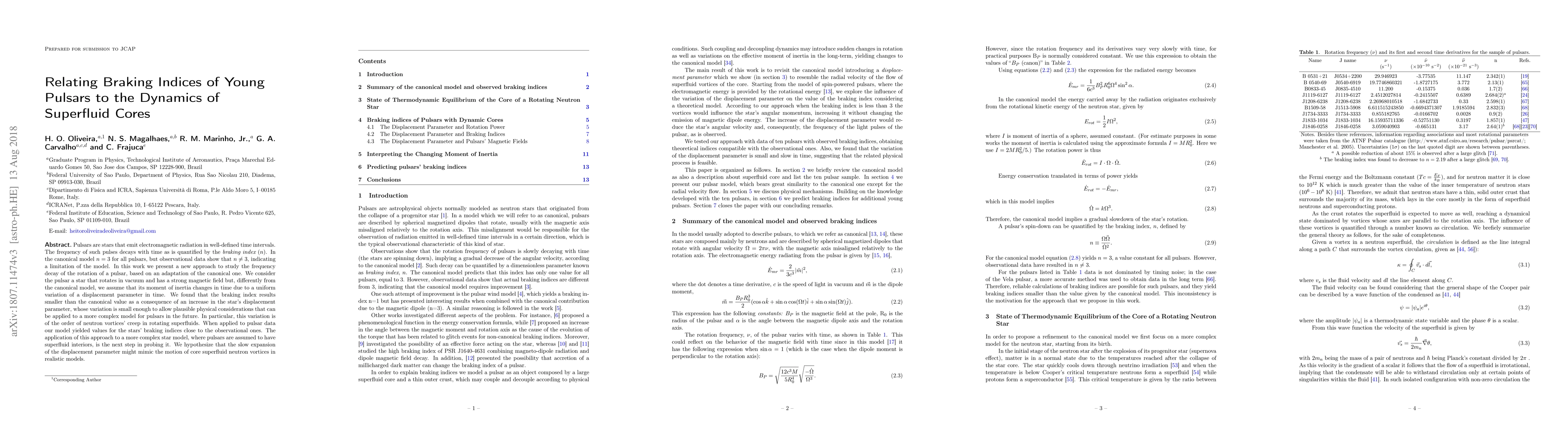 Pulsars are stars that emit electromagnetic radiation in well-defined time intervals. The frequency of such pulses decays with time as is quantified by the {\it braking index} ($n$). In the canonical model $n = 3$ for all pulsars, but observational data show that $n \neq 3$, indicating a limitation of the model. In this work we present a new approach to study the frequency decay of the rotation of a pulsar, based on an adaptation of the canonical one. We consider the pulsar a star that rotates in vacuum and has a strong magnetic field but, differently from the canonical model, we assume that its moment of inertia changes in time due to a uniform variation of a displacement parameter in time. We found that the braking index results smaller than the canonical value as a consequence of an increase in the star's displacement parameter, whose variation is small enough to allow plausible physical considerations that can be applied to a more complex model for pulsars in the future. In particular, this variation is of the order of neutron vortices' creep in rotating superfluids. When applied to pulsar data our model yielded values for the stars' braking indices close to the observational ones. The application of this approach to a more complex star model, where pulsars are assumed to have superfluid interiors, is the next step in probing it. We hypothesize that the slow expansion of the displacement parameter might mimic the motion of core superfluid neutron vortices in realistic models.