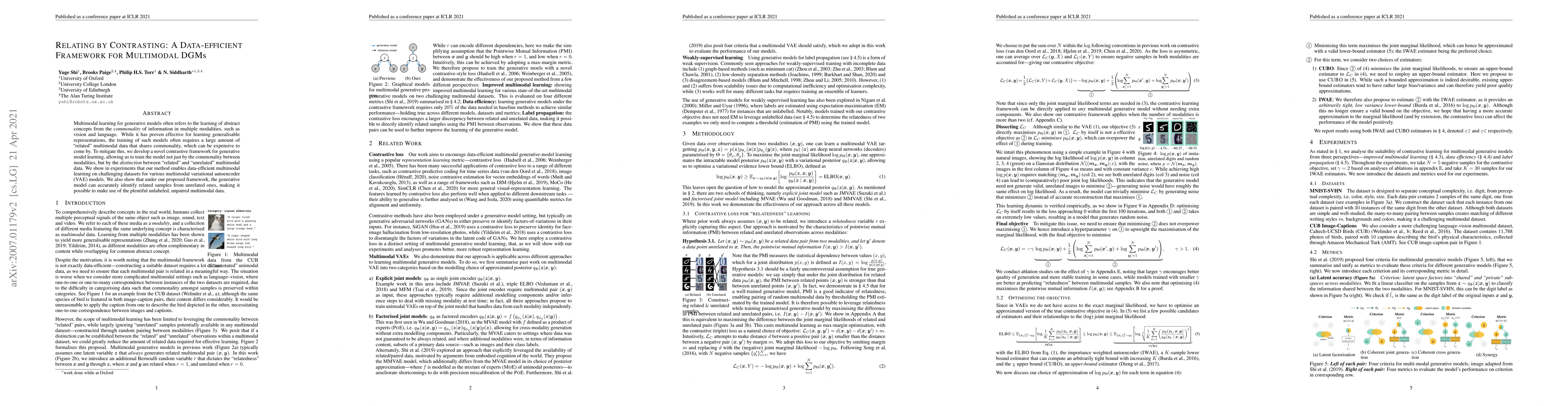 Multimodal learning for generative models often refers to the learning of abstract concepts from the commonality of information in multiple modalities, such as vision and language. While it has proven effective for learning generalisable representations, the training of such models often requires a large amount of "related" multimodal data that shares commonality, which can be expensive to come by. To mitigate this, we develop a novel contrastive framework for generative model learning, allowing us to train the model not just by the commonality between modalities, but by the distinction between "related" and "unrelated" multimodal data. We show in experiments that our method enables data-efficient multimodal learning on challenging datasets for various multimodal VAE models. We also show that under our proposed framework, the generative model can accurately identify related samples from unrelated ones, making it possible to make use of the plentiful unlabeled, unpaired multimodal data.